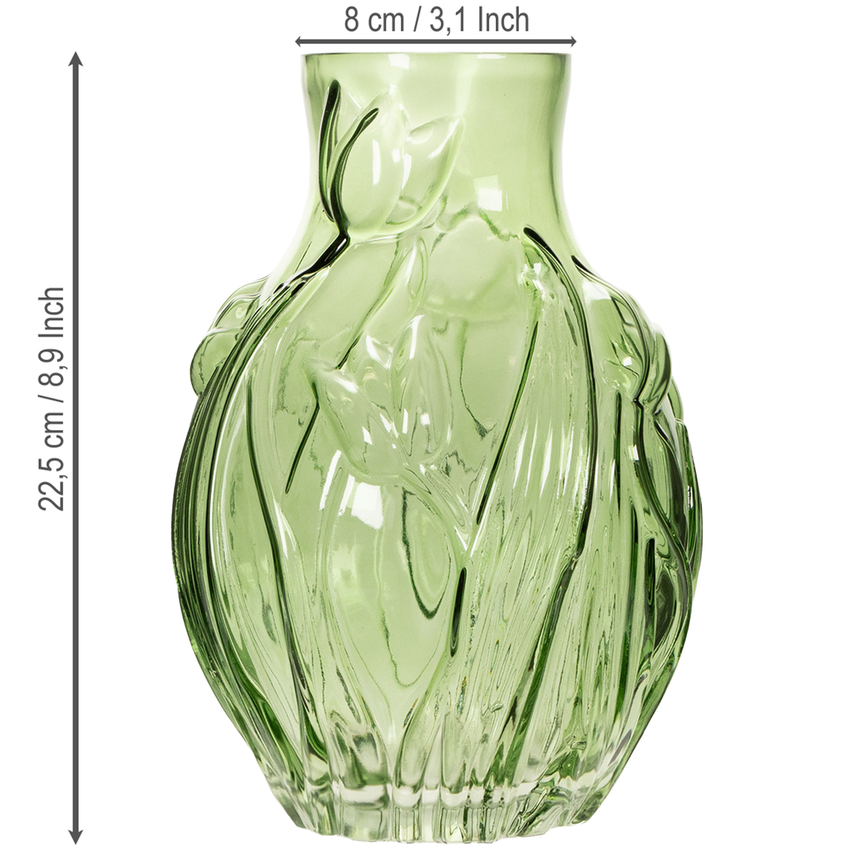 Haben Sie schon einmal eine Vase gesehen, die so charmant und stilvoll ist, dass man sie unbedingt haben möchte? Unsere grüne Glastulpenvase mit geprägtem Tulpendesign könnte genau dieses Schmuckstück für Ihr Zuhause sein. Mit ihrer attraktiven grünen Farbe und der perfekt durchdachten Form vereint sie zeitloses Design mit Funktionalität. Ob Sie sie auf einem Sideboard, einem Esstisch oder in Ihrem Schlafzimmer platzieren, diese Vase wird garantiert zum Blickfang!
