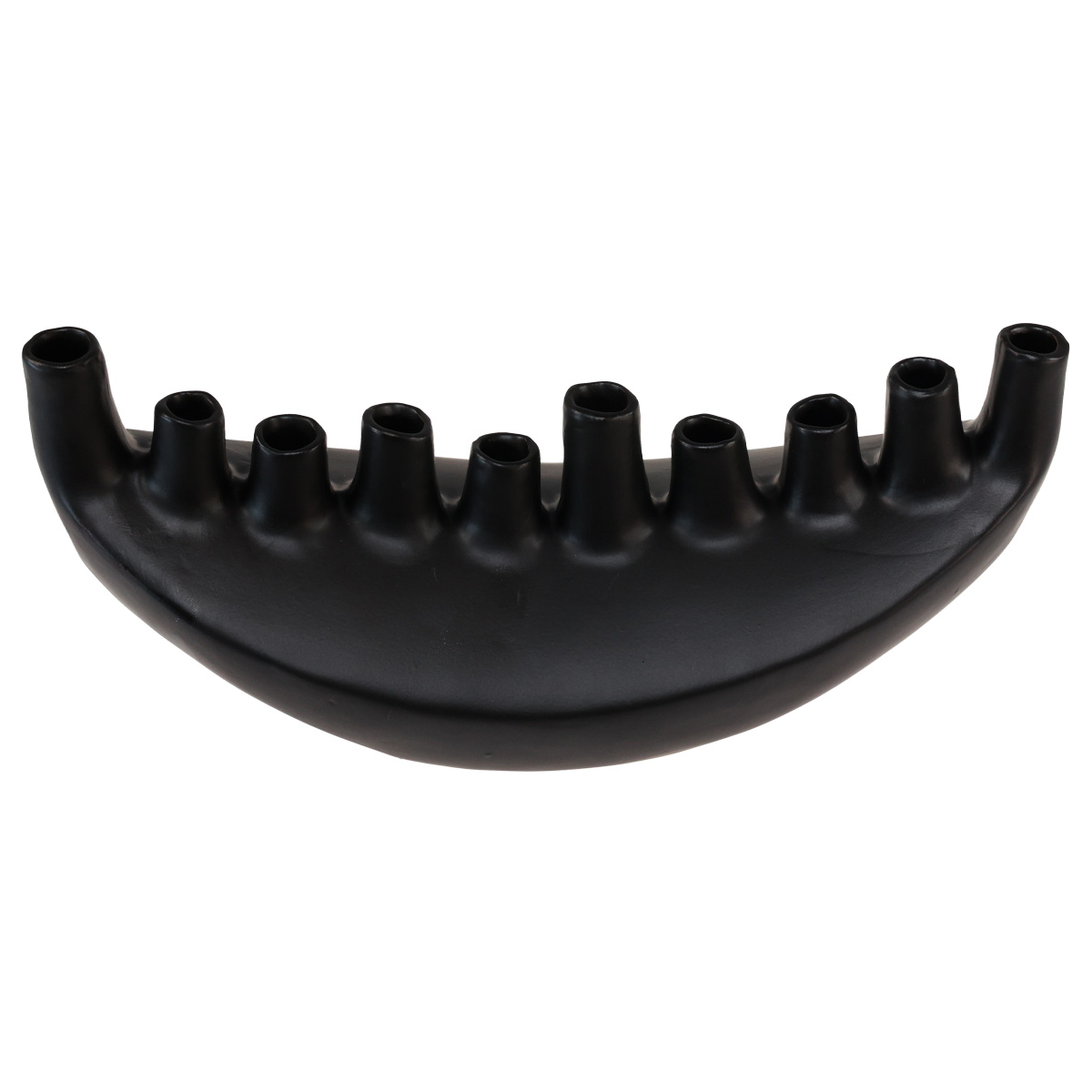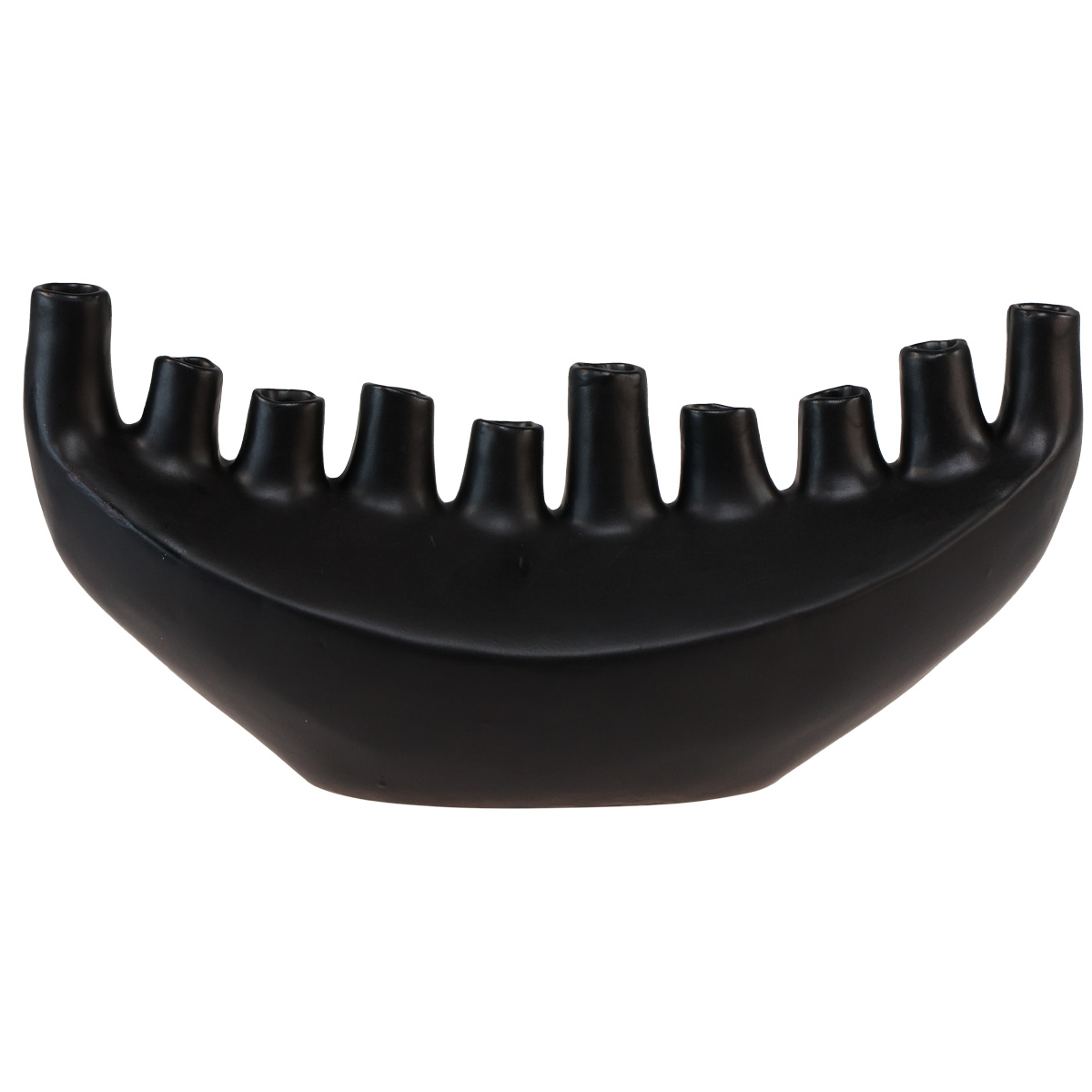 Questo moderno vaso in ceramica a forma di nave astratta attirerà l'attenzione nella tua casa come decorazione da tavolo nera!Il vaso è realizzato in ceramica verniciata nera opaca e presenta un totale di dieci aperture di vasi astratti di diverse altezze. La barca è vuota all'interno.