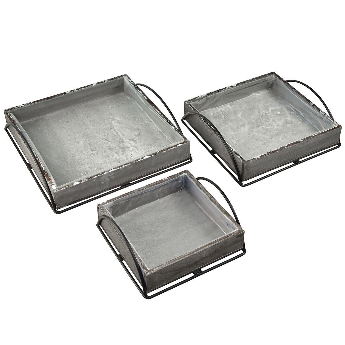 Scopri il nostro set di 3 vassoi in legno lavato grigio e bianco poggiati su eleganti strutture in metallo. Ogni vassoio in legno con manici in metallo non solo fornisce un comodo spazio per riporre gli oggetti, ma aggiunge anche un tocco di classe a qualsiasi tavola. Per organizzatori di eventi, decoratori e fioristi, questo set di vassoi in legno di varie dimensioni è un'aggiunta ideale al loro repertorio di elementi decorativi.