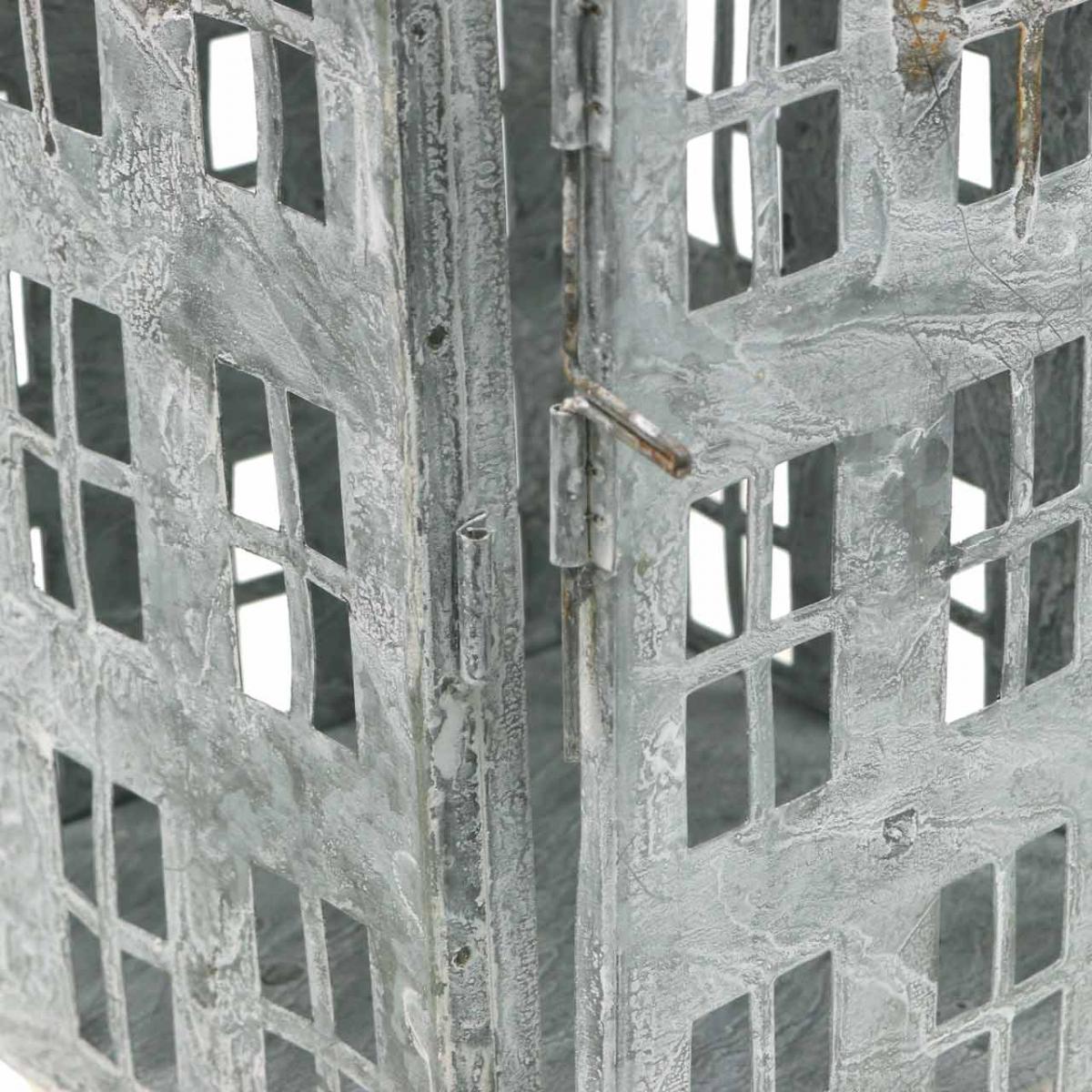 Der Vintage-Look aus milchigem Schleier und Rostflecken ist Resultat davon, dass die Laterne weiß gewaschen wurde. Der Kerzenhalter sieht wie ein Miniatur-Hochhaus aus und wirkt mit entsprechendem Leuchtmittel besonders auch bei Dunkelheit bewohnt.