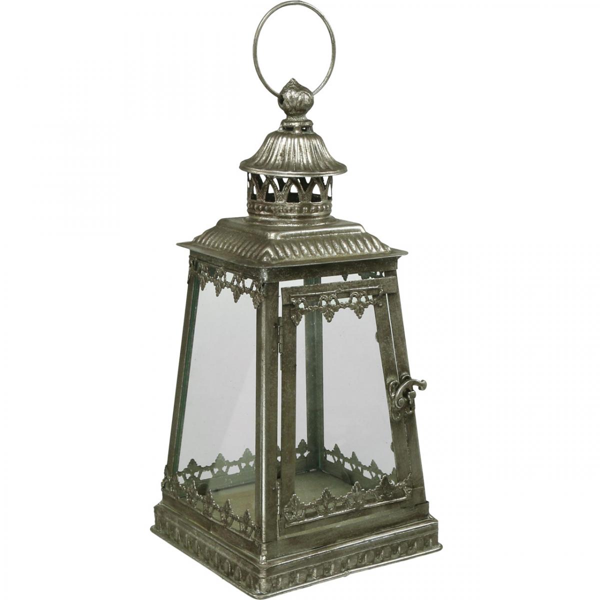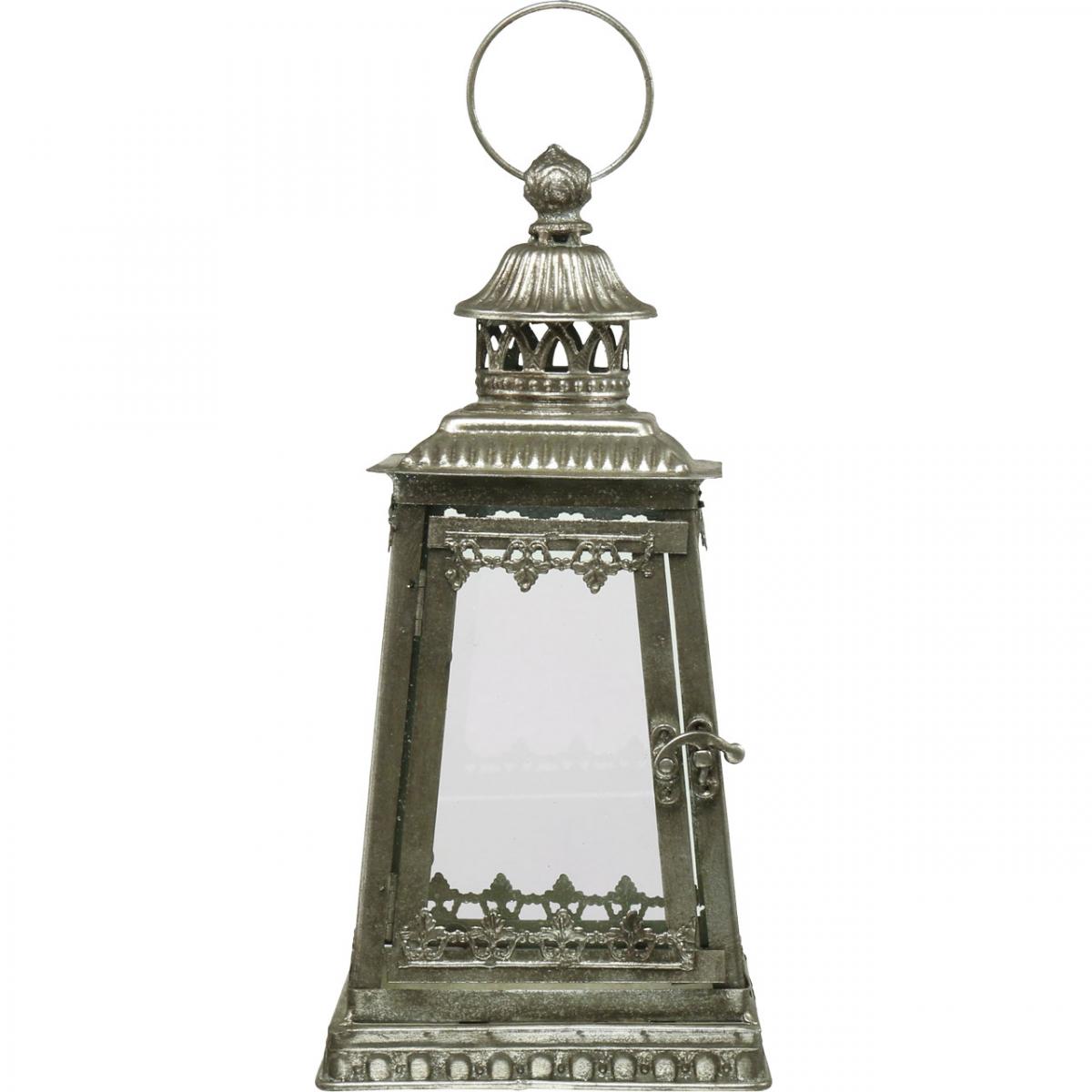 Cette lanterne décorative au look vintage tendance est un bel éclairage pour l'intérieur et l'extérieur et peut même faire plus qu'éclairer. La lanterne de jardin se compose de métal et de quatre fenêtres en verre, dont l'une peut être ouverte avec un volet. La lanterne peut être remplie de bougies ou de lumières LED comme lanterne et d'accessoires décoratifs comme sanctuaire miniature.Le cadre en métal de la lanterne est orné d'ornements et d'une patine artificielle qui fait ressembler la surface à de l'argent vieilli. La forme angulaire de la lanterne de jardin converge vers le haut pour former un petit toit avec une ouverture ronde et ornée et un anneau en métal pour la suspendre. Les ouvertures sont destinées aux bougies chauffe-plat et aux bougies afin qu'il y ait suffisamment d'oxygène pour brûler.