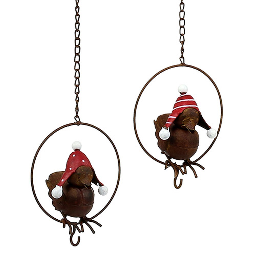 Cet oiseau posé dans un anneau sert de support à nourriture et est en même temps une idée déco raffinée pour votre balcon, votre terrasse ou votre jardin. Fabriqué en métal aspect rouillé, ce support résistant aux intempéries se compose d’un grand anneau entourant un oiseau, d’un chainette de suspension dotée d’un crochet et d’un second crochet sur la partie inférieure destiné celui-ci à recevoir les boules de graisses. L’oiseau porte un bonnet à pompon parsemé de points sur l’un des modèles et de traits sur l’autre et apportera beaucoup de charme à votre décoration d’hiver et de Noël.Avec ses deux supports à nourriture, vous allez pouvoir approvisionner les oiseaux dans votre jardin ou sur votre balcon et avez également de quoi décorer joliment votre intérieur. En automne et en hiver, ces oiseaux à suspendre feront de ravissants ornements pou vos fenêtres et pourront même être suspendus au plafond dans votre salon ou tout autre pièce de la maison. Vous profiterez alors du crochet situé en dessous pour remplacer les boules de graisse par des éléments de décoration comme par ex. un collier de perles. Ces suspensions auront assurément un grand succès - à l’extérieur comme à l’intérieur.