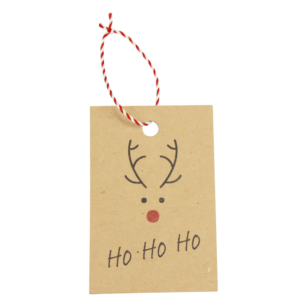 Der Geschenkanhänger besteht aus stabiler Kartonage, die bereits mit einem Loch für die Kordel zum Aufhängen versehen ist. Die weißrot gestreifte Kordel finden Sie extra verpackt am Stück. Sie lässt sich leicht zurechtschneiden. Das Rentier ist mit schwarzen Augen, dem Geweih und natürlich der roten Nase angedeutet. Unter dem Gesicht prangen Weihnachtsmanns Worte: Ho Ho Ho.