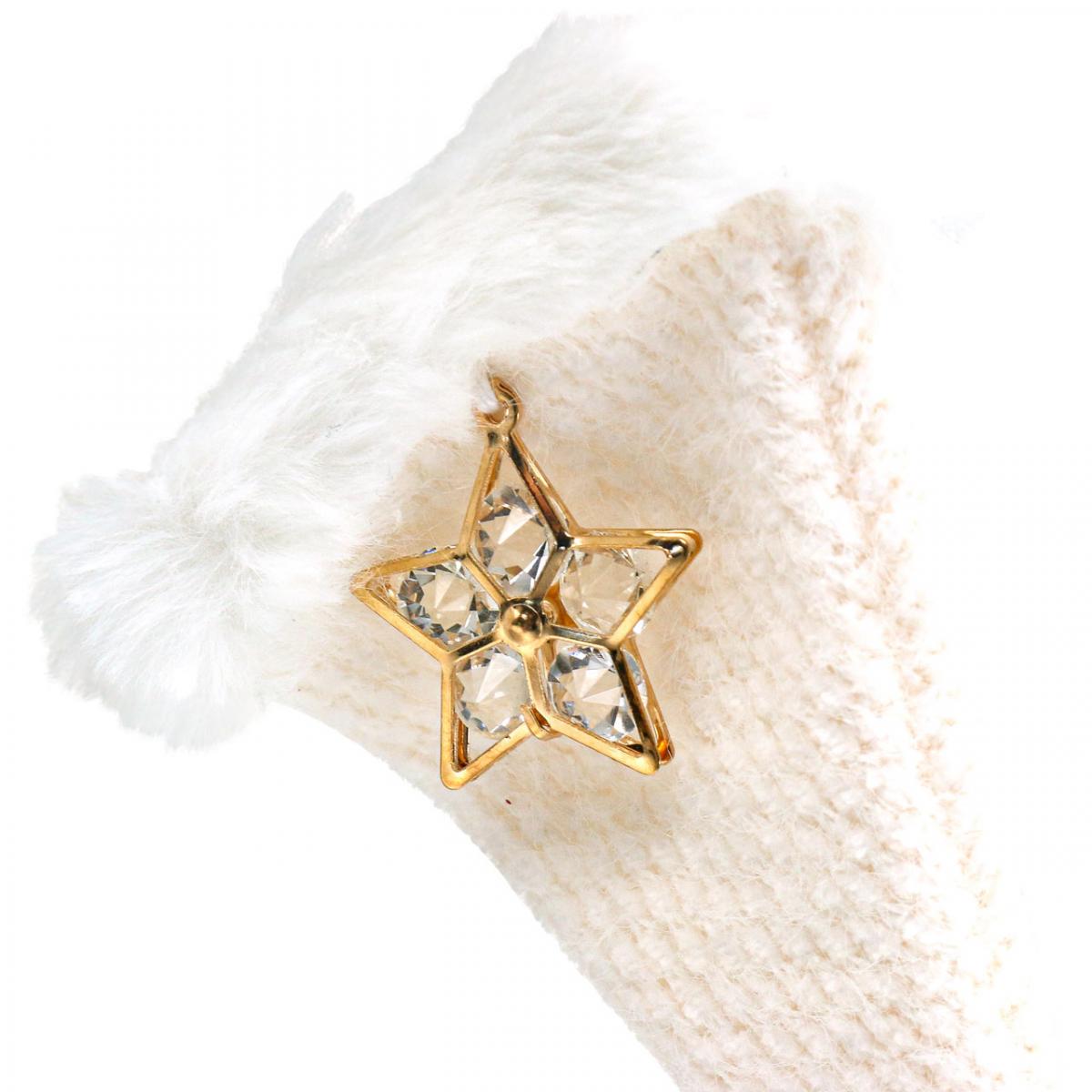 Insgesamt gibt es sechs cremefarbene Weihnachtsanhänger: drei Handschuhe und drei Zipfelmützen. Die Weihnachtsdeko hat einen weißen Rand aus Filz und ein weißes Band zum Aufhängen. An jedem Anhänger baumelt ein doppelter, goldfarbener Stern mit fünf Zacken, der mit fünf funkelnden Glaskristallen besetzt ist.