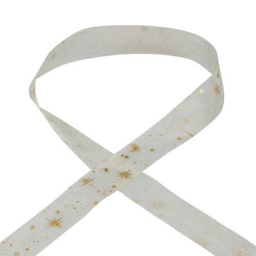 Le ruban décoratif de Noël en organza blanc avec des étoiles dorées se présente sous la forme d'un ruban d'une largeur d'environ 25 millimètres enroulé sur une bobine en plastique. La longueur totale du ruban organza est d'environ 25 mètres.