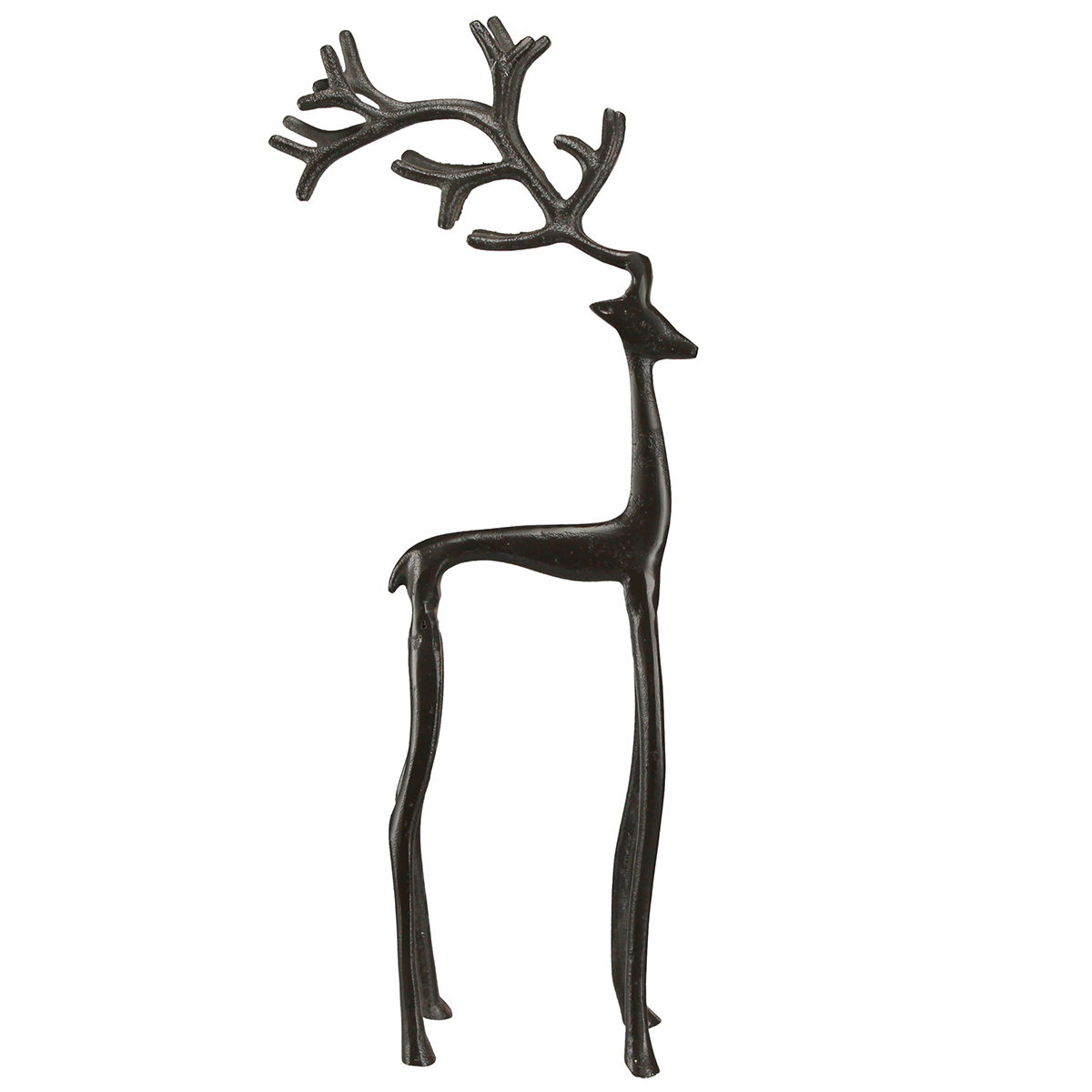 Das dunkelbraune Rentier aus Metall erinnert mit seinem Stil an afrikanische Figuren und ist somit ein außergewöhnliches Deko-Element für jede weihnachtliche Umgebung. Sein schmaler Körper und das lange, erhabene Geweih verleihen der Figur eine grazile Eleganz, während leichte Verzierungen das Fell andeuten. Auch für skandinavische Arrangements ist dieses Rentier bestens geeignet und verleiht Ihrem Wohnzimmer, der Fensterbank oder der festlichen Tafeldekoration einen besonderen Charme.
