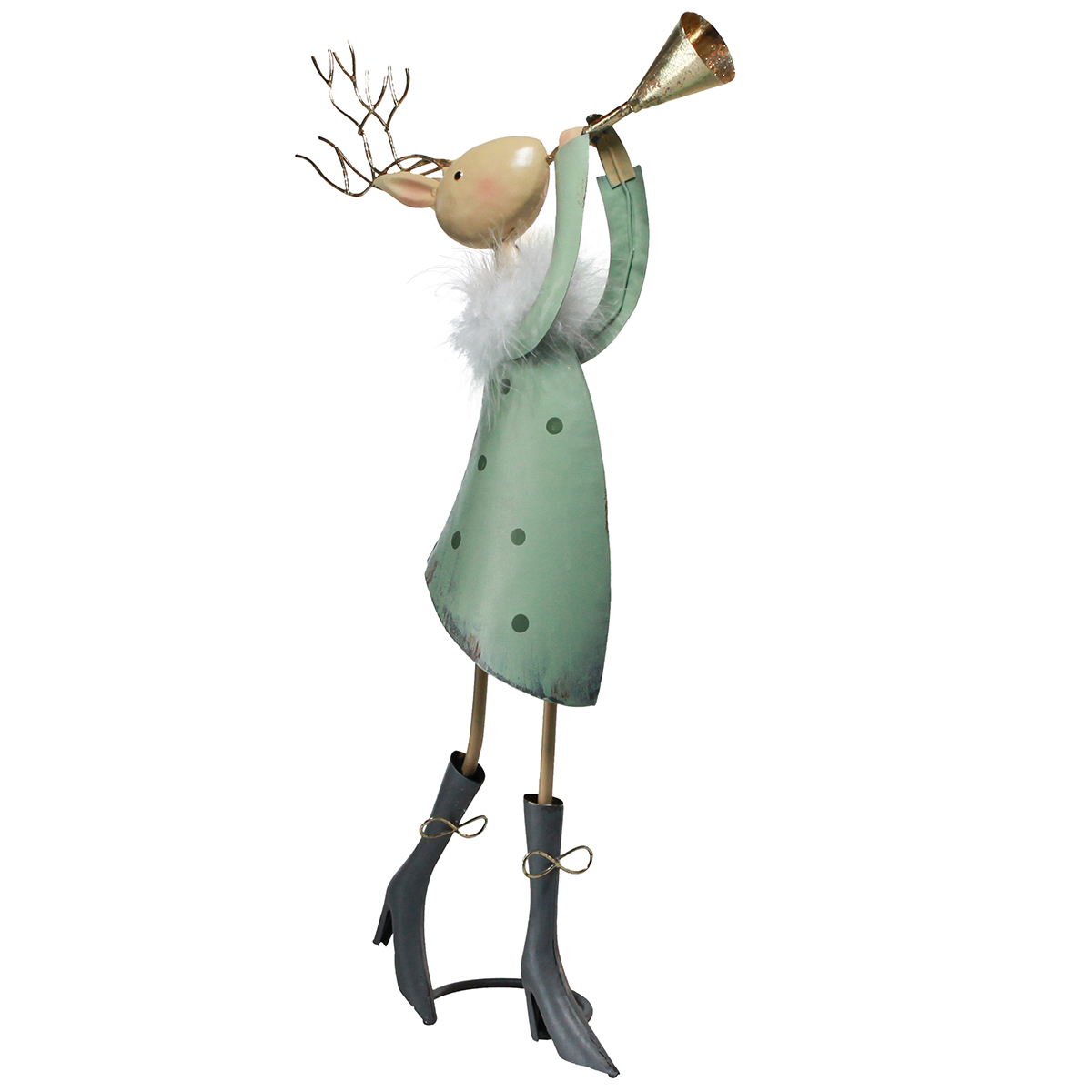Weihnachtsfigur aus Metall mit Trompete – orginelle Hirsch-Deko in Grün und Gold