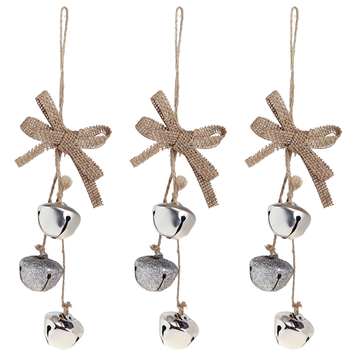 Das Trio der Weihnachtsglöckchen in Silber ist die perfekte Ergänzung für Ihren Christbaumschmuck. Die Kombination aus glänzenden, matten und glitzernden Oberflächen verleiht jedem Raum ein edles Ambiente. Dank der Aufhänger und Schleifchen aus Jute können diese Weihnachtsglöckchen einfach und schnell am Baum aufgehängt werden.