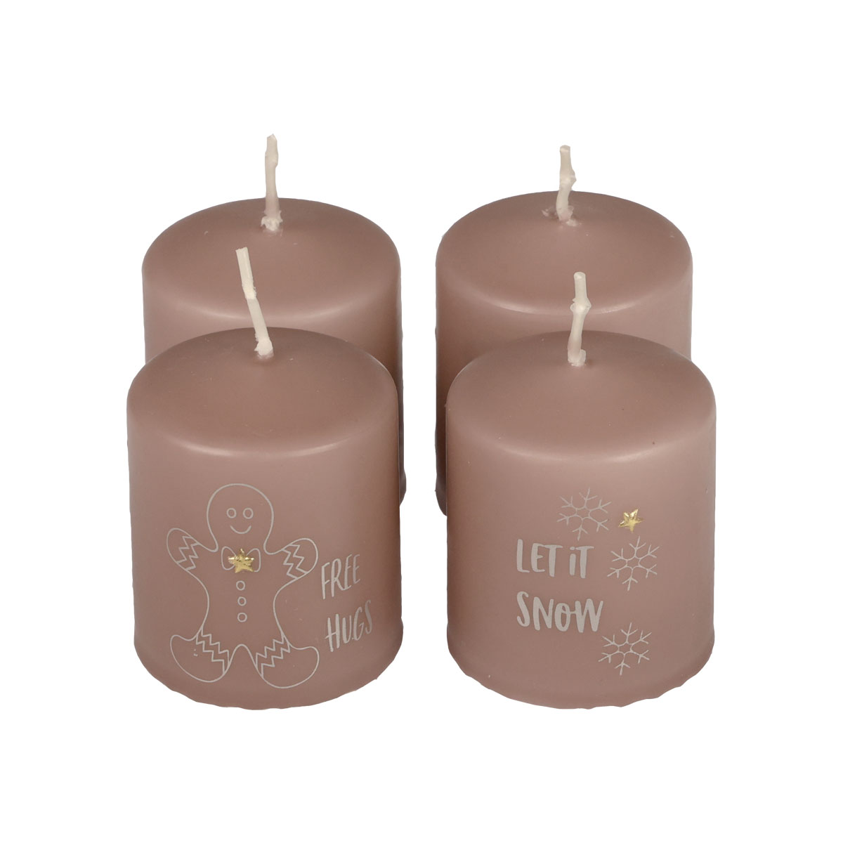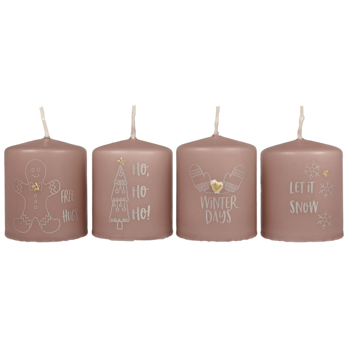 Les quatre bougies piliers ont chacune un motif différent : sapin de Noël, bonhomme en pain d'épices, gants et flocons de neige. Il y a aussi une petite inscription assortie au motif, par exemple un doux « Free Hugs » sur le bonhomme en pain d'épices.