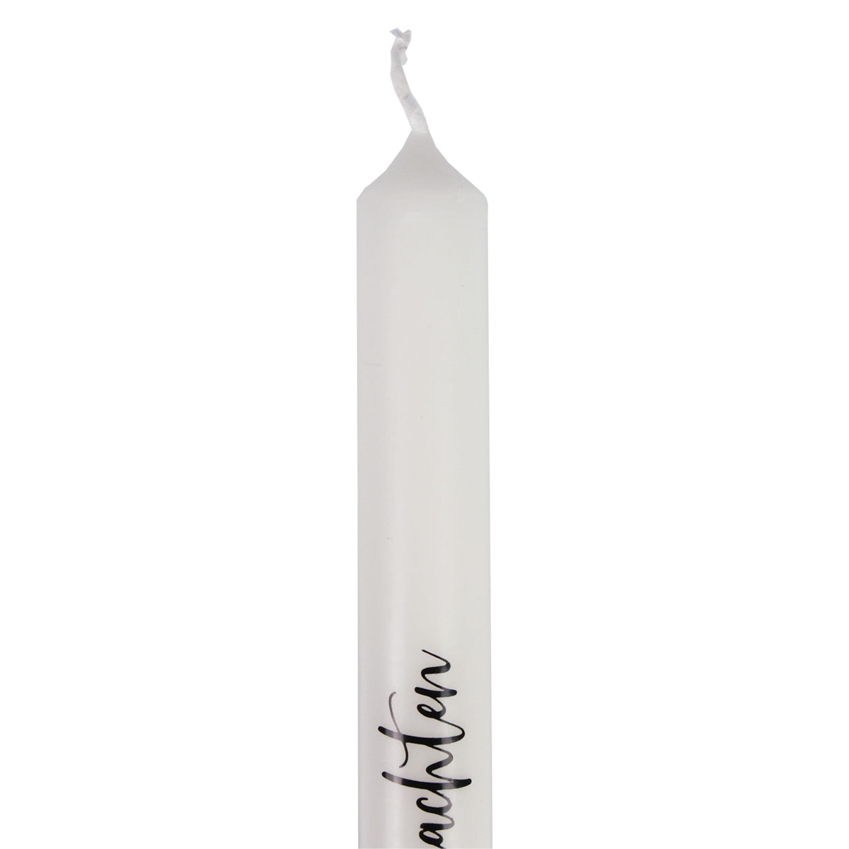 Stern und Schrift sind auf den Stabkerzen mittig platziert. Durch die weiße Farbe der Weihnachtskerzen wird der goldene, glänzende Stern zum Blickfang. Die schön geschwungene Schrift in Schwarz und die klassische Farbe Weiß lassen die Stabkerzen besonders gut in einem klassischen Arrangement in Ihrer Weihnachtsdeko aussehen.