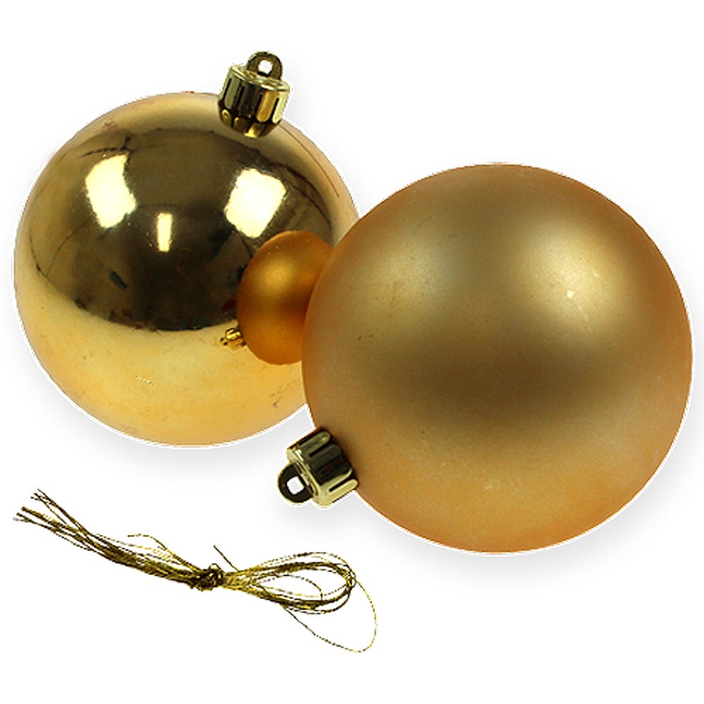Embellissez votre sapin avec ces jolies boules de Noël dorées ! Les boules pour sapin de Noël de haute qualité se composent entièrement de matière synthétique et sont ainsi incassables et très légères. Le lot décoratif de Noël comprend 2 boules mates et 2 brillantes toutes munies d'un œillet pour y glisser les fils dorées joints à la livraison. Vous pourrez bien évidemment utiliser d'autres fils ou vous en passer si vous vous servez des boules par exemple en décoration de table ou en ornement de la couronne de l’Avent.Pour changer, n’hésitez pas à exposer les boules décoratives dans une coupe et complétez-les avec des branches de sapin, d'autres boules et un photophore. Vous pourrez insérer les boules à l'aide de fil de bricolage dans un anneau vierge et ainsi apporter à votre déco une touche colorée et raffinée. Pensez également à accrocher les boules sur une guirlande lumineuse et rehaussez ainsi votre décoration de fenêtre à Noël !