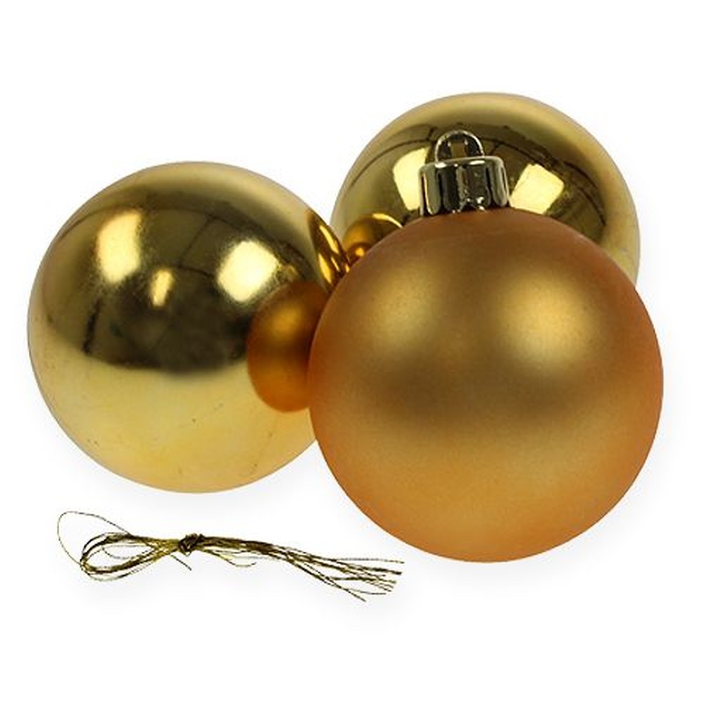 Die Weihnachtskugel aus Plastik in Gold wird als Paket zu insgesamt 12 Stück geliefert und hat mit der Öse eine Gesamtlänge von circa 7 Zentimetern. Die Kugel selbst hat einen Durchmesser von circa 6 Zentimetern.