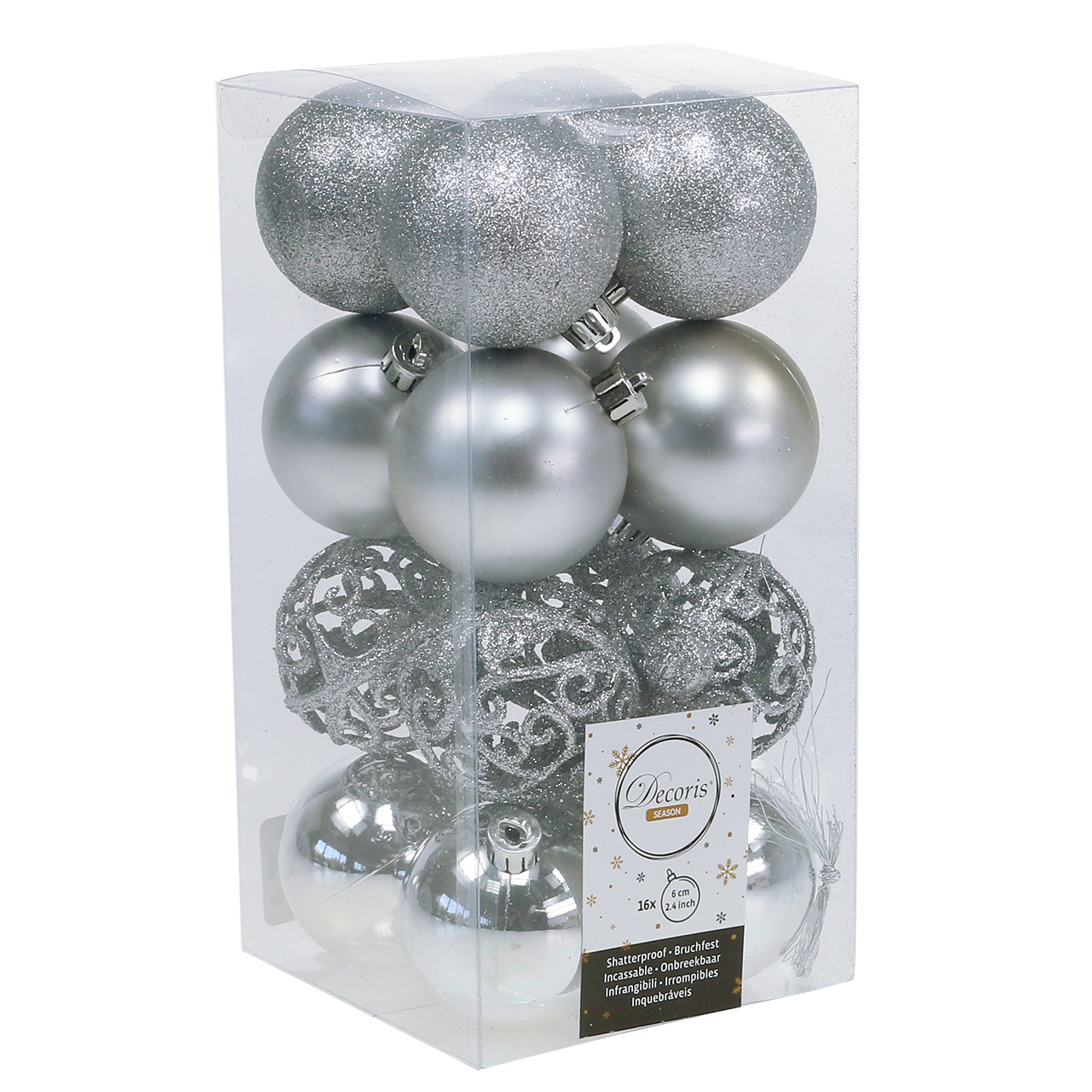 L'argent est une des couleurs de base à la période de Noël, ce qui fait de ce lot de 16 boules de Noël de 4 modèles différents la décoration parfaite à cette belle période de l'année ! Il contient respectivement 4 boules brillantes, 4 argentées mates, 4 argentées scintillantes et 4 boules pailletées avec des fioritures ornementales -voici un mélange qui représente la décoration idéale pour l'ornement du sapin !Toutes les boules de ce mélange sont composées d’une matière synthétique incassable, sont garnies de petits chapeaux avec leur œillet et les fins rubans synthétiques argentés pour l'attache sont également compris dans la livraison. Décorez ainsi avec les boules un arbre de Noël entièrement dédié au thème de la glace et de la neige ou fixez-les dans une couronne décorative recouverte de neige que vous suspendrez dans votre vitrine de magasin, dans un hall d'attente ou encore sur votre propre porte ! L'ornement pour sapin peut également être mis en scène sur un plateau décoratif ou dans un arrangement de l'Avent -comme vous le voyez, la période de Noël vous offre des possibilités d'aménagement infinies !