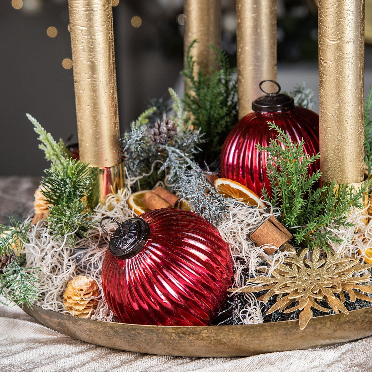 Diese Weihnachtskugeln tragen den trendigen Used-Look. Dazu sind die Christbaumkugeln mit leichten künstlichen Sprenkeln versehen. Auch die Lamellen-Form der Außenseite erinnert an ein altes Design.Zum Aufhängen ist bereits ein Organzaband um die Öse gebunden. Diese stellt einen Ring dar, was den Vintage-Charakter unterstreicht. Während das zarte Organzaband in Rot gehalten ist, ist der Aufhänger dunkelbraun und metallisch. Auch diese Feinheit zeigt den Retro-Charakter bei den Weihnachtskugeln aus Glas.