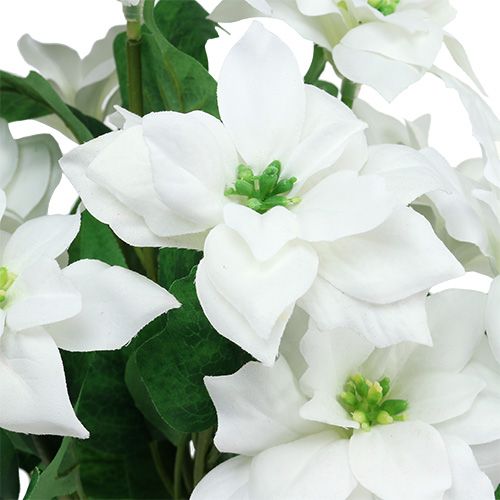 Der künstliche Weihnachtsstern in Weiß misst als Strauß eine Gesamtlänge von etwa 45 Zentimetern, während der Blütendurchmesser ungefähr 10 Zentimeter misst.