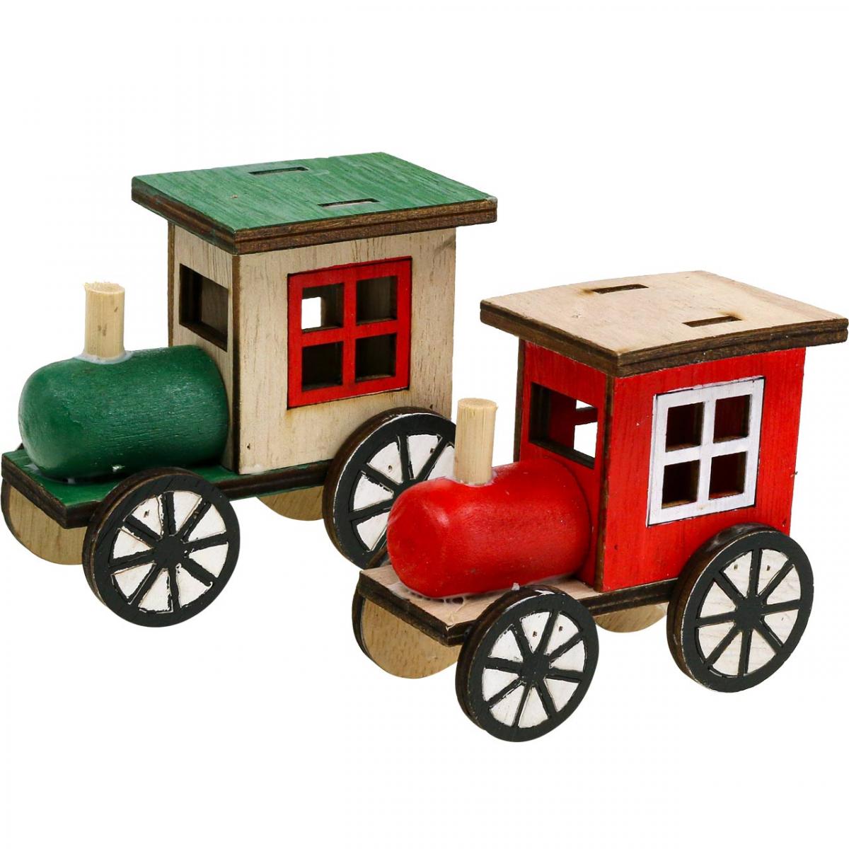 Sie erhalten insgesamt vier Deko-Lokomotiven für Weihnachten. In der Pappbox sind jeweils zwei Loks je Farbausführung enthalten.