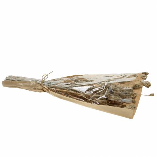 Sie erhalten den Bund getrocknete natürliche Schafgarbe in einer Blumentüte aus Kraftpapier und Folie, zusammengebunden mit einem Band aus Jute. Das Füllgewicht beträgt etwa 150 Gramm, was in etwa 30 Natur-Stängeln entspricht. Die Größe der einzelnen Pflanzen kann dabei zwischen 30 und 60 Zentimetern schwanken. Die Größe der Köpfe variiert ungefähr zwischen 1 und 3 Zentimetern.