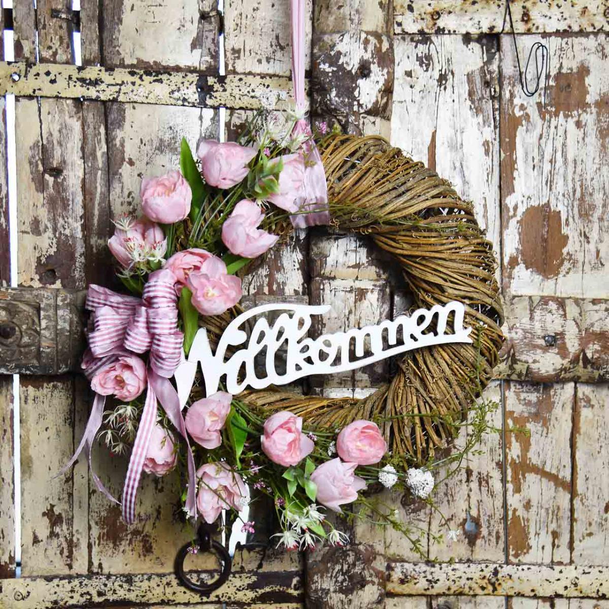 Besonders in einem frühlingshaften Ambiente erstrahlt der Holzhänger mit Blüten, einer Schleife aus Jute oder Schleifenband und kleinen Dekofiguren geschmückt besonders schön und heißt Ihre Gäste wunderbar willkommen.