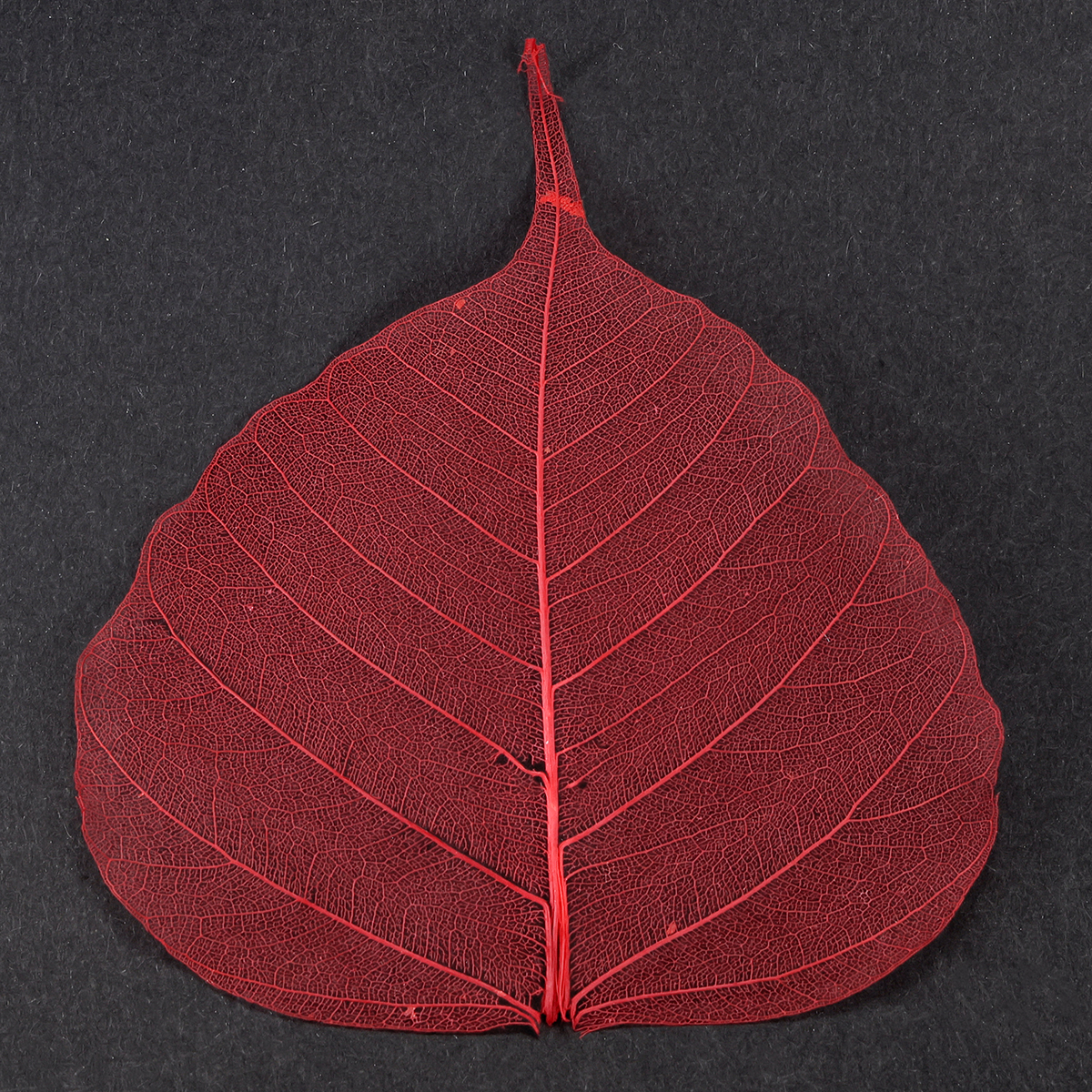 Que la nature peut être belle ! Cette feuille rouge et squelettique de l'arbre Bodhi est aussi appelée feuille squelette, feuille voile ou feuille squelette.La feuille naturelle a été soigneusement bouillie à l'eau de Javel, ne laissant intact que le squelette de la feuille Bodhi. Ce procédé de préservation protège non seulement ce décor naturel coloré du vieillissement, mais le rend également moins fragile. De plus, les feuilles de saule ont été teintes d'un rouge vif. Les nervures principales des feuilles apparaissent légèrement plus claires, créant un magnifique contraste.