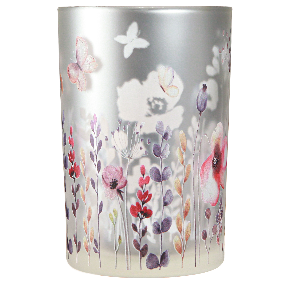 Windlicht aus Glas Mohn Schmetterling Silber Farbe H18cm