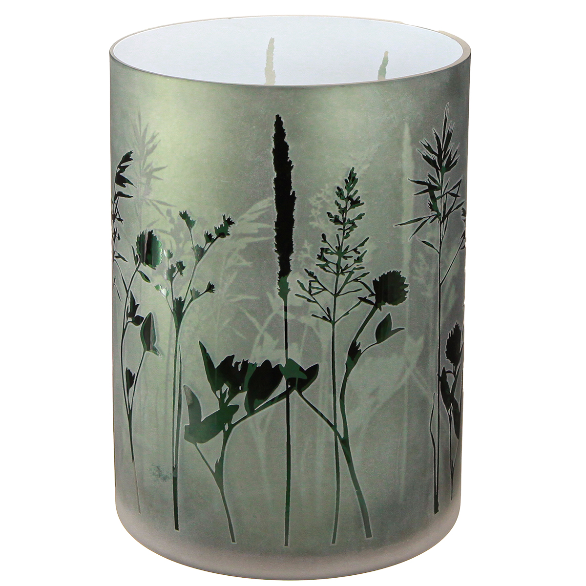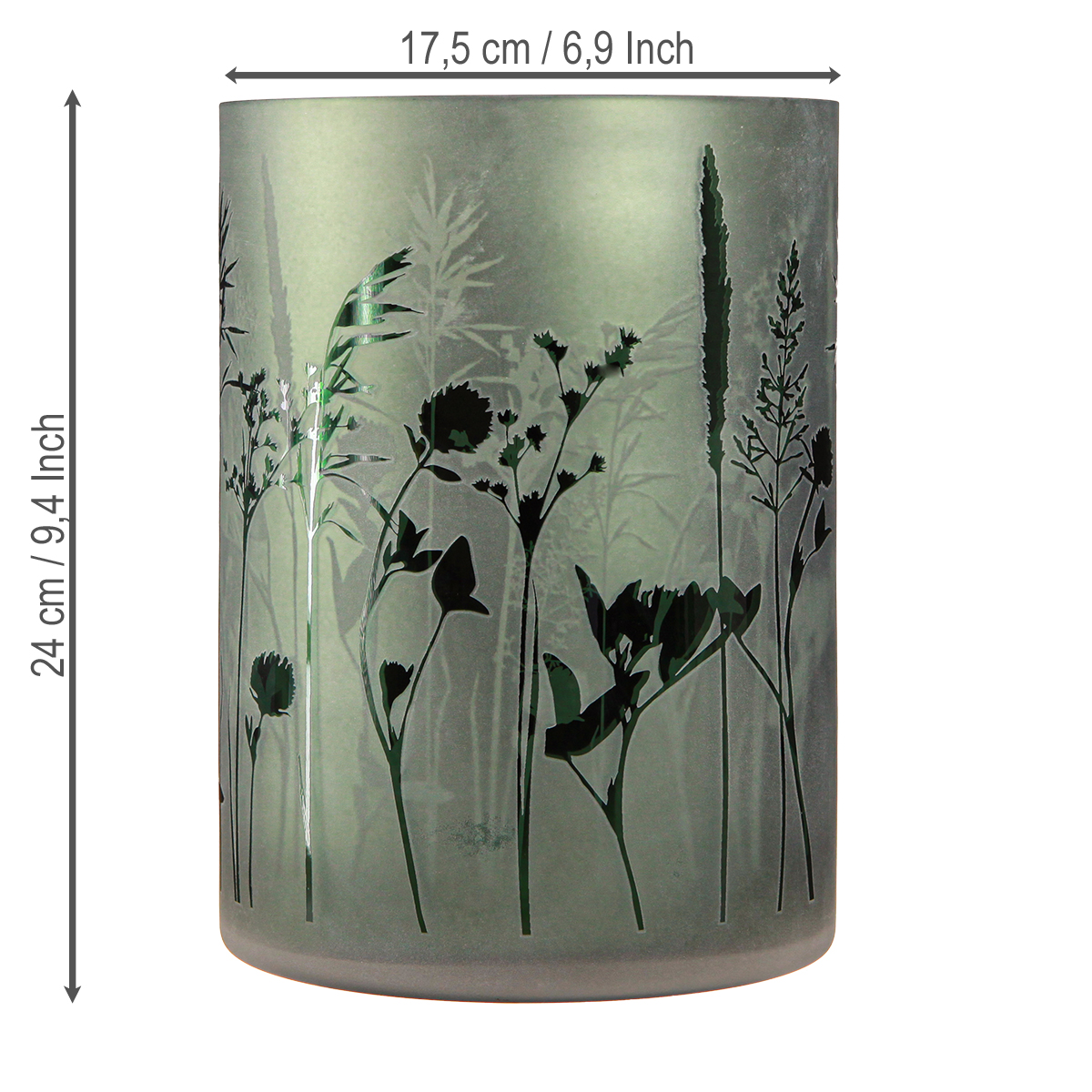 Windlicht Groß Deko Glas in Weiß Grün Motiv Wiese H24cm