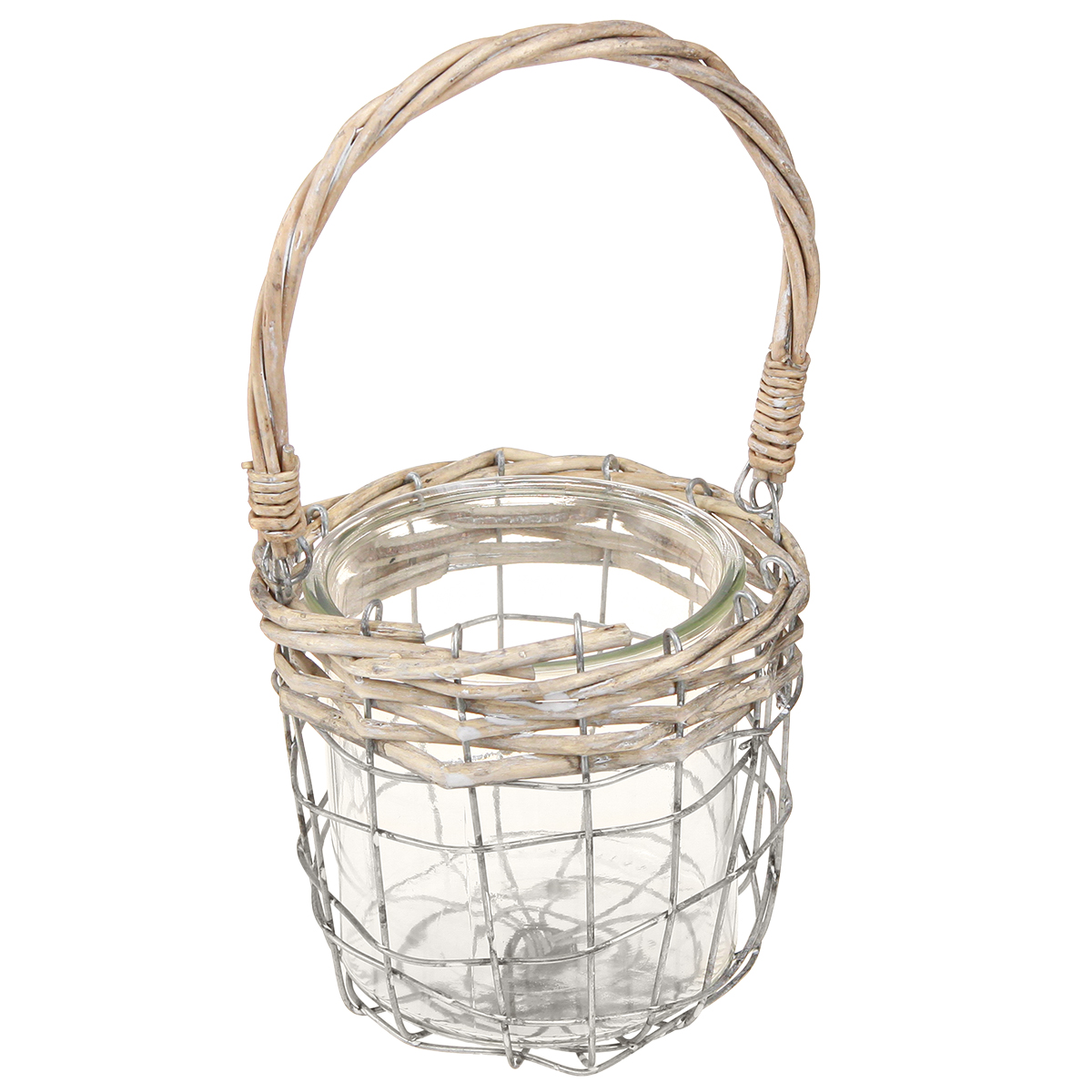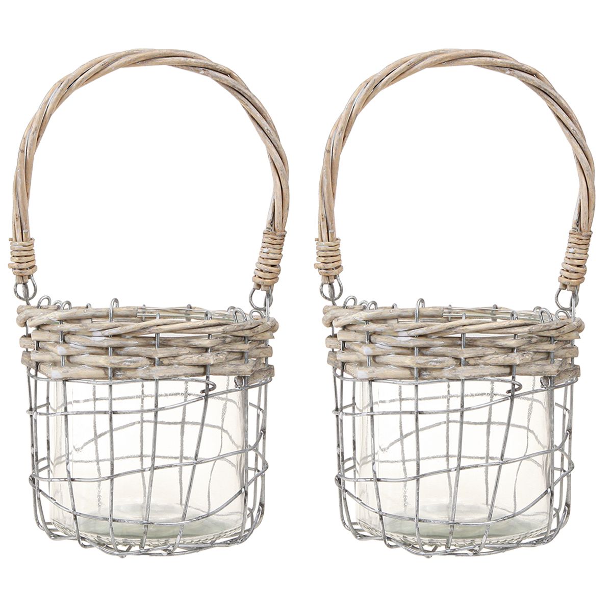Bringen Sie mit unserem Windlicht zum Hängen aus Glas und Metall eine einzigartige Atmosphäre in Ihren Garten oder auf Ihren Balkon. Die zwei rustikal gestalteten Windlichter haben je einen Durchmesser von etwa 14,5 cm. Dieses charmante Wohnaccessoire vereint rustikale Eleganz mit funktionaler Vielseitigkeit. Der obere Teil des Windlichts ist mit grau gewaschenen Weidenzweigen verkleidet, was dem Stück einen besonderen Vintage-Touch verleiht. Die Basis aus robustem Metall sorgt für Langlebigkeit und Stabilität. Ein beweglicher Henkel aus Weide ermöglicht das einfache Aufhängen oder Umplatzieren der Windlichter. Perfekt geeignet ist die Hänge- und Tischdeko für romantische Abendbeleuchtung, Hochzeitsdekorationen oder Gartenpartys. Das herausnehmbare Glas ist ideal für Stumpenkerzen oder größere Teelichter und lässt jede Kerze in vollem Glanz erstrahlen. Aufgrund der verwendeten Materialkombinationen eignet sich dieses Windlicht hervorragend für rustikale, maritime oder durch Vintage inspirierte Dekostile.