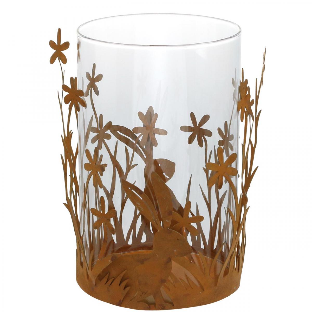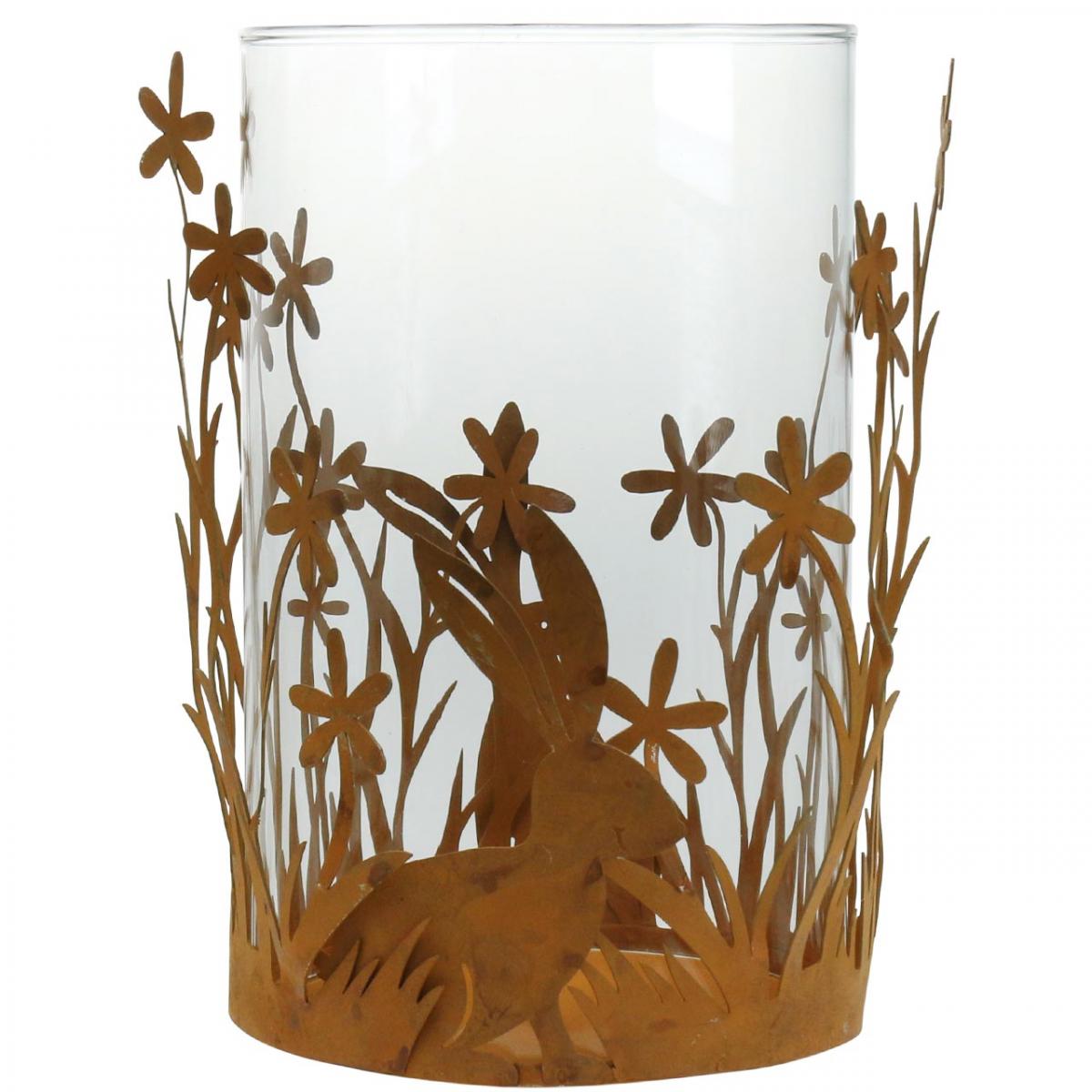 Windlicht mit Hasen, Frühlingsdeko, Metalldeko mit Blumen, Ostern Edelrost Ø11,5cm H18cm