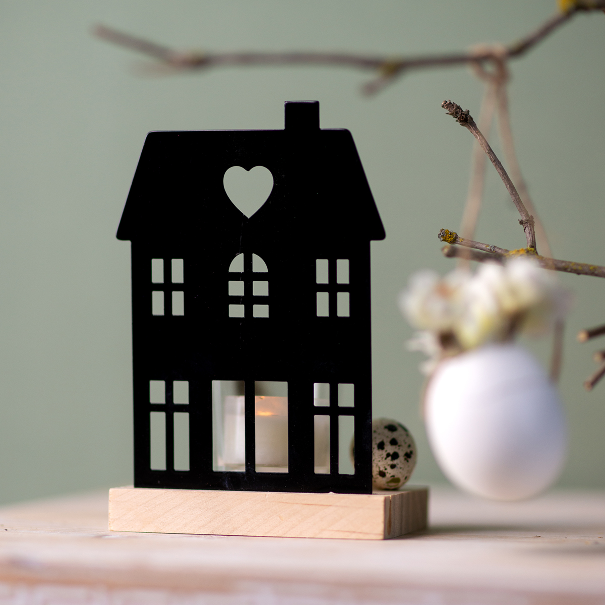 Windlicht Haus Metall Schwarz mit Holz Sockel H15cm 2St