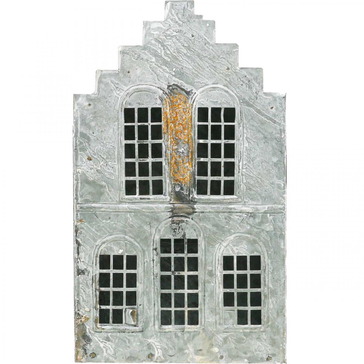 Il faro è un portacandele in metallo in stile shabby chic di tendenza. Il tea light house crea un'atmosfera piacevolmente calda, soprattutto nella stagione buia. La casetta in metallo per lumini è anche un attraente elemento decorativo per la tavola o il davanzale durante il giorno senza lume di candela.La casa di metallo ha un tetto a due falde appuntito su cui si trova un camino aperto. La parte anteriore del faro è particolarmente ben elaborata. Sul tetto della casa del lumino, la facciata della casa ha una forma a scala, sotto la quale ci sono cinque alte finestre.