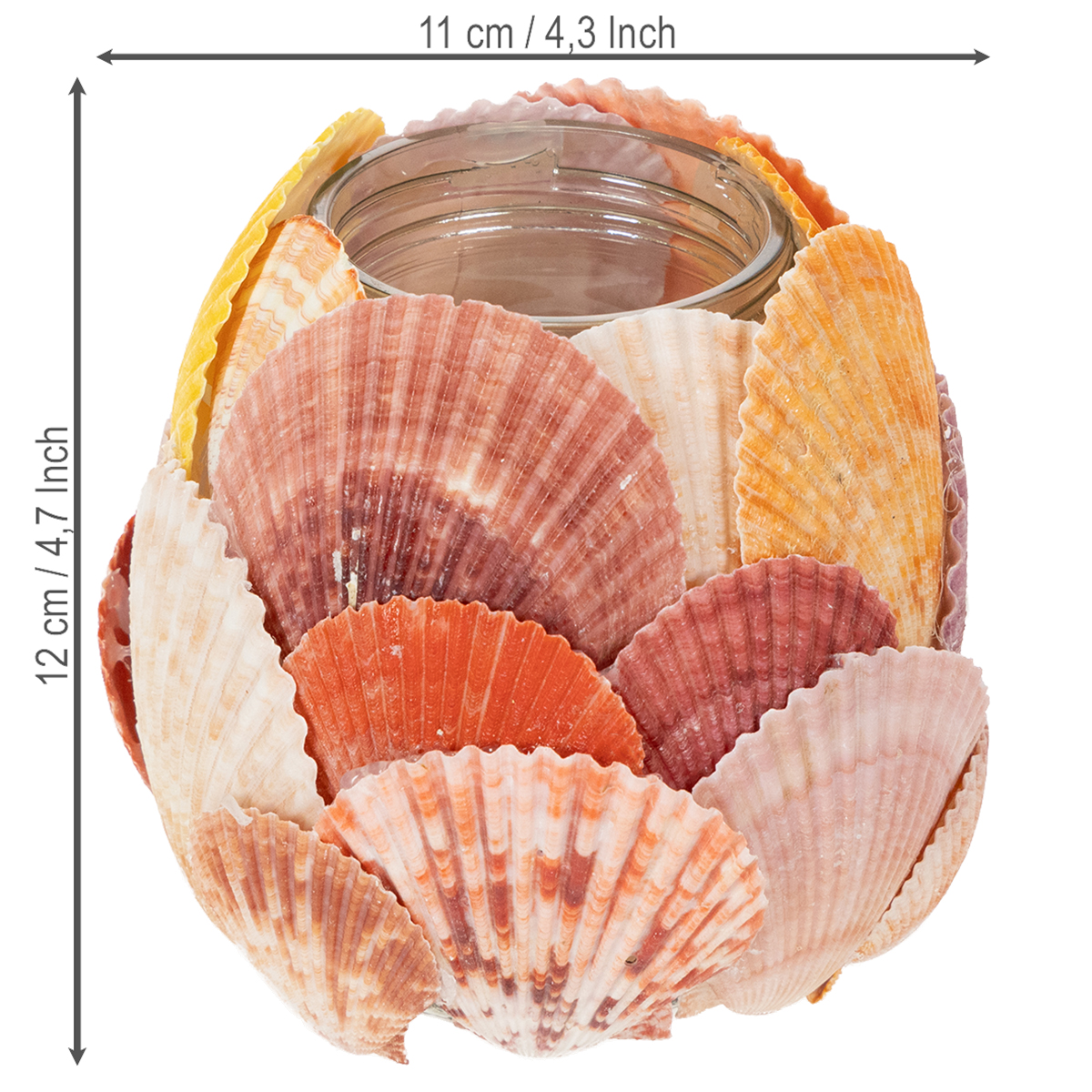 Con un'altezza di 12 centimetri, un diametro di 11 centimetri e la sua forma maneggevole, il portacandele si adatta perfettamente a diversi stili di arredamento. I colori naturali delle conchiglie si armonizzano particolarmente bene con mobili in stile country o nautico.