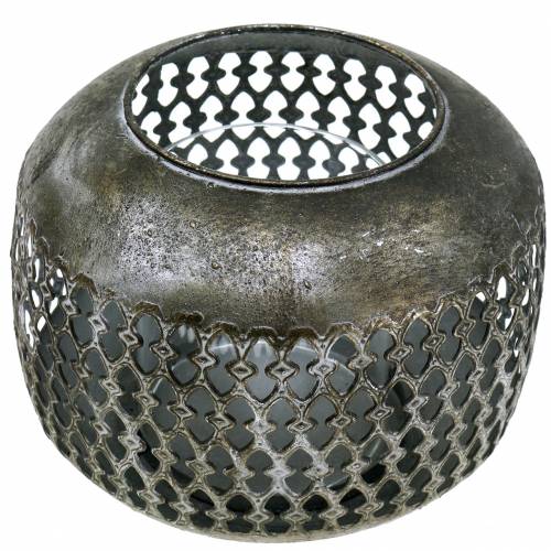 Ein märchenhafter Zauber des Orients umgibt dieses edle Windlicht in runder Form. Kunstvoll mit Ornamenten versehen, wurde die Laterne aus Metall gefertigt und mit zusätzlich antik patiniert. Ein innenliegender Glaszylinder, der nach oben und unten offen ist, schützt die Kerzenflamme vor Wind.