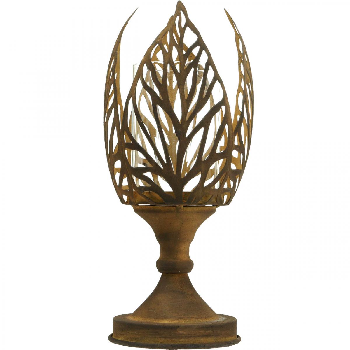 Als Tischdeko auf der Terrasse oder dem Balkon ist dieses Windlicht in Rost-Optik ein echter Hingucker. Der Edelrost-Look macht sich gerade gut in einem Ambiente mit Retro-Charakter, aber auch mit Vintage-Stil. Edel wirkt die Metalldeko vor allem durch ihre Form. Der halb offene, halb geschlossene, filigran gestaltete Blütenkelch trägt das Windlicht in sich.Der gläserne Behälter zum Schutz einer Kerze ist ohne Boden. In das Glas lässt sich ein Teelicht oder eine Kerze mit etwa 7 Zentimetern im Durchmesser stellen. Die Kerze steht sicher auf der extra dafür eingebauten Fassung im Kelch. Das Kerzenglas selbst können Sie zum Reinigen jederzeit herausnehmen und später wieder einsetzen.