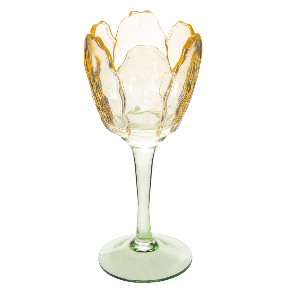 Ce photophore en verre en forme de tulipe séduit par son design floral exceptionnel et ses proportions parfaites. Mesurant 20 centimètres de hauteur et 9 centimètres de diamètre, il est idéal pour décorer une table, une étagère ou une guéridon. La fleur en verre jaune s'harmonise à merveille avec un décor moderne, classique ou même rustique.