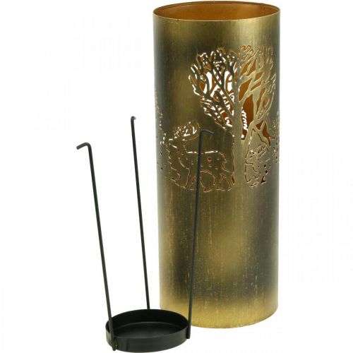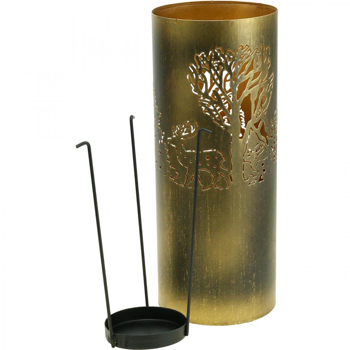 Questi tre portacandele in metallo vintage, illuminati, raffigurano un cervo che cammina attraverso una foresta. Ogni portacandele è realizzato in lamiera sagomata a forma cilindrica e ha una base in metallo.L'interno e l'esterno dei candelieri sono color oro, con la superficie esterna anch'essa rifinita con vernice nera, che insieme crea una nobile patina vintage. Le sagome degli alberi e dei cervi sono state delicatamente ricavate dalla lamiera. Puoi vedere abeti e grandi alberi a foglie caduche, tra i quali ci sono tre cervi.