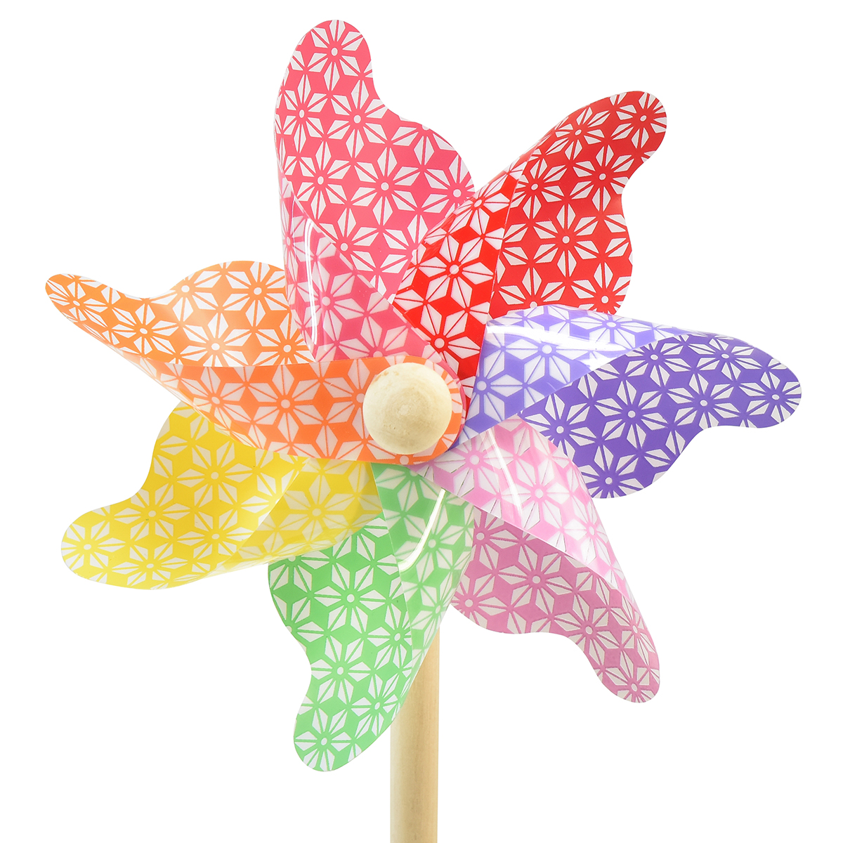 Ein Muster aus einem Mix aus Karo und Blüte ziert in Weiß die farbenfrohe Windmühle am Stab. Jedes Blatt hat eine andere Farbe, während das Gestell aus hellem Holz besteht. Zwei goldfarbene Nieten aus Metall halten das Windrad in Form. In Orange, Gelb, Grün, Rosa, Rot und Lila bringt das Windrad Farbe in Ihre Beete und Blumenkästen.