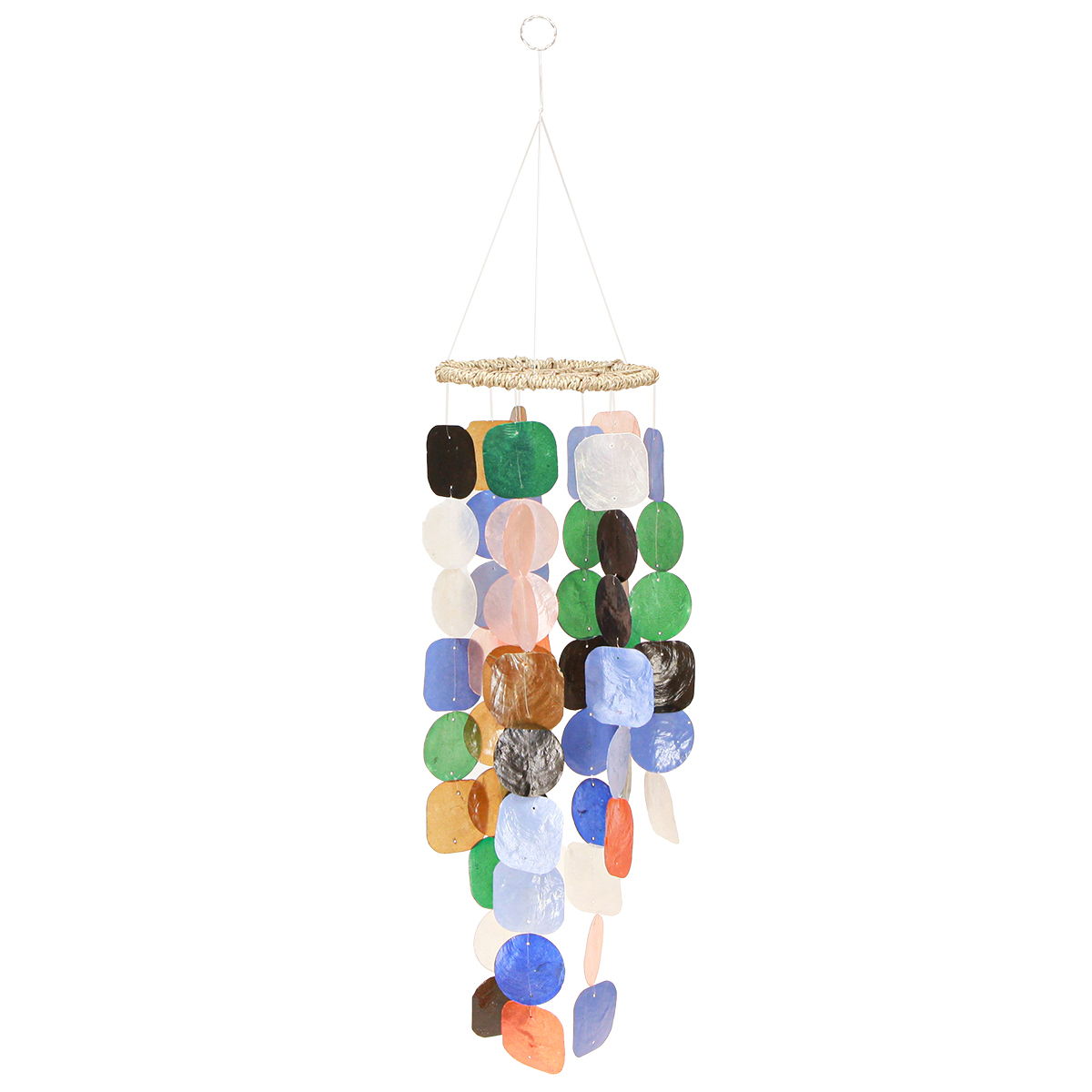 Avec ce magnifique carillon éolien avec coquillages Capiz, vous pouvez apporter une pure atmosphère de vacances dans votre maison et votre jardin ! – Le carillon éolien ressemble à un souvenir de pays étrangers : des cordons en nylon incolore relient des tranches colorées de coquillages en nacre, coupés en rond ou en rectangulaire, pour créer une décoration maritime enchanteresse à suspendre.Au total, neuf brins de différentes longueurs sont suspendus à un anneau enveloppé d'algues. Les coquillages chatoyants, encore légèrement transparents malgré leur couleur, scintillent à la lumière et émettent un son clair lorsqu'une légère brise souffle à travers le mobile.