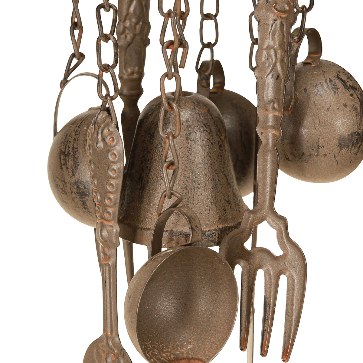 Profitez d’un intermède musical aux effets bienfaiteurs : ce carillon extravagant en forme de théière remplira votre décoration de jardin de sons idylliques. Le carillon est fabriqué en métal. Sur la théière, pièce centrale, sont accrochés des corps de résonance en fonte sous forme d'ustensiles de cuisine et au centre se trouve une magnifique cloche. Le ravissant jeu des sons se produira lorsque le mobile se bercera doucement au vent. Le charme tout particulier de cette décoration de jardin est de plus souligné par son aspect ancien.