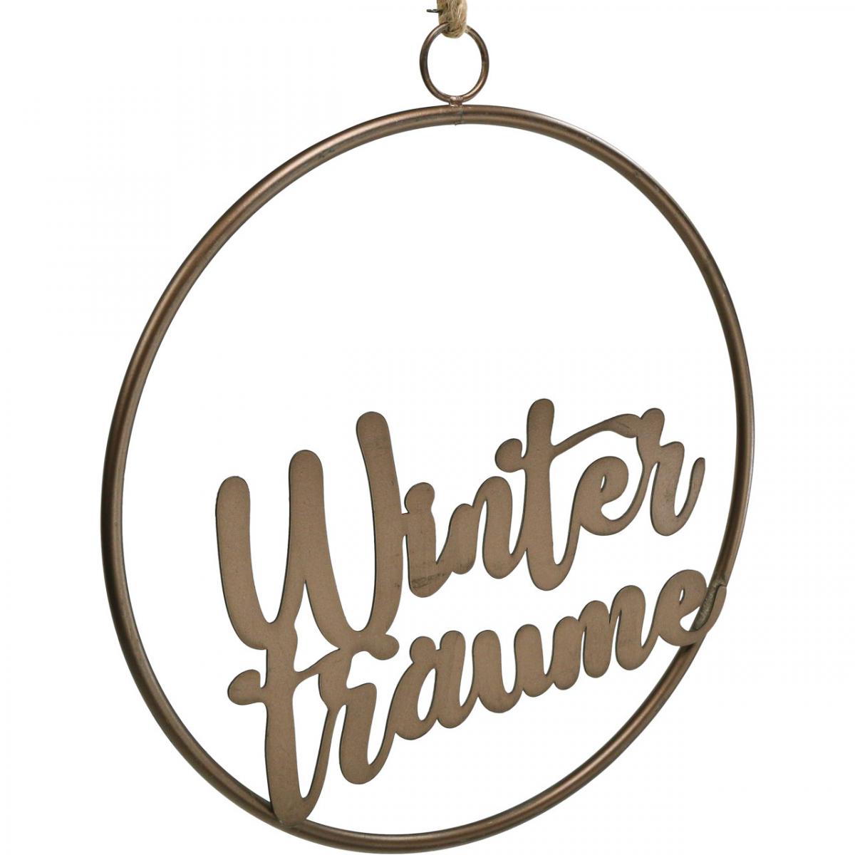 Il manque encore à votre décoration d'hiver une décoration de fenêtre suspendue ? Que diriez-vous de ce lettrage "Wintertäume" dans l'anneau décoratif en métal ?La décoration de fenêtre simple et en même temps inhabituelle se présente dans un beau ton bronze mat. Le lettrage décoratif est conçu en deux lignes dans une police cursive originale. - Équipée d'un cordon de jute, la belle décoration de lettrage peut être accrochée à merveille comme décoration de fenêtre ou objet décoratif dans le salon.