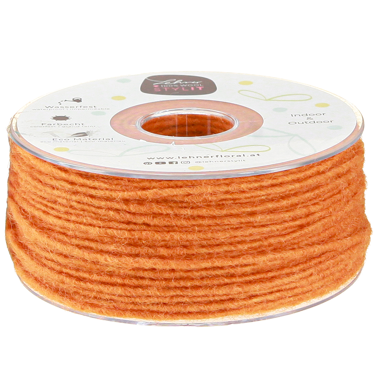 Die orangefarbene Wollschnur ist etwa 100 Meter lang und circa 3 Millimeter dick, wobei diese Stärke aber auch aufgrund der Flexibilität des Materials leicht abweichen kann. Sie erhalten die zu 75% aus Wolle und zu 25% aus Jute gefertigte Deko-Kordel aufgerollt auf einer Kunststoff-Spule.