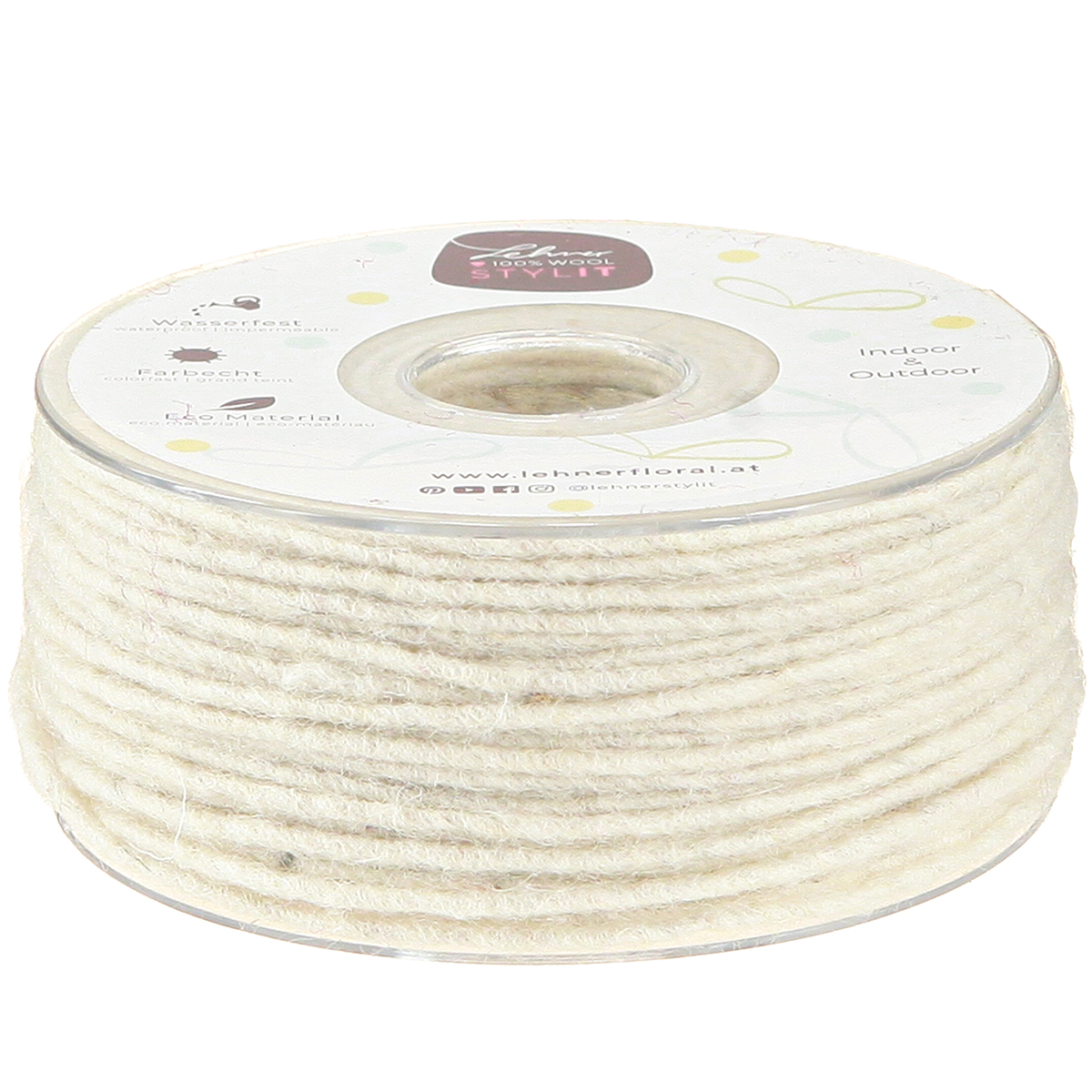 Laissez-vous inspirer par cette ficelle de laine blanche de haute qualité munie d'un cœur en jute pour réaliser vos projets créatifs. Elle se distingue non seulement par sa résistance à la décoloration et à la lumière mais aussi par sa structure très solide et imperméable ! La cordelette de feutrine en pure laine est une aide indispensable dans le domaine de l'art floral, particulièrement en ces périodes ou la décoration prône le retour au naturel.Servez-vous par exemple de la ficelle de feutrine comme fil d'attache bien pratique ou créez une attrayante décoration de fenêtre à la période de Noël en prenant la cordelette décorative comme base pour une guirlande avec des flocons de neige ou en l’utilisant comme cordelette de suspension pour une couronne en branches de sapin. Tout au long de l’année, vous pourrez envelopper de manière décorative des vases, des photophores ou des récipients à plantes avec le fil de laine et de cette façon créer des motifs stylés. Procédez par exemple comme suit avec des rondelles en bois, une base de décoration prisée autant chez les professionnels que chez les amateurs de bricolages : entourez une rondelle avec le ruban en laine en formant une étoile et utilisez-la comme base pour une décoration romantique dans le cadre d'un mariage !