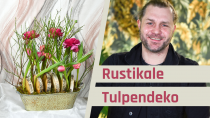 Diese rustikale DIY-Dekoration mit Tulpen zaubert den Frühling auf den Tisch! Die rustikale Frühlingsdeko könnt ihr ganz einfach selber machen – in unserer Video-Anleitung verraten wir euch dafür Schritt für Schritt alle Tricks. Das Gesteck mit Tulpen wartet für die natürliche Deko im Frühling mit frischen Farben auf. Birken-Holzscheiben, ein Vintage-Pflanztopf und Moos passen perfekt zur Jahreszeit und lassen die Tischdeko mit Tulpen schön urig aussehen. Alle Produkte, mit denen ihr die Tulpen und Ranunkeln dekorieren könnt, findet ihr hier