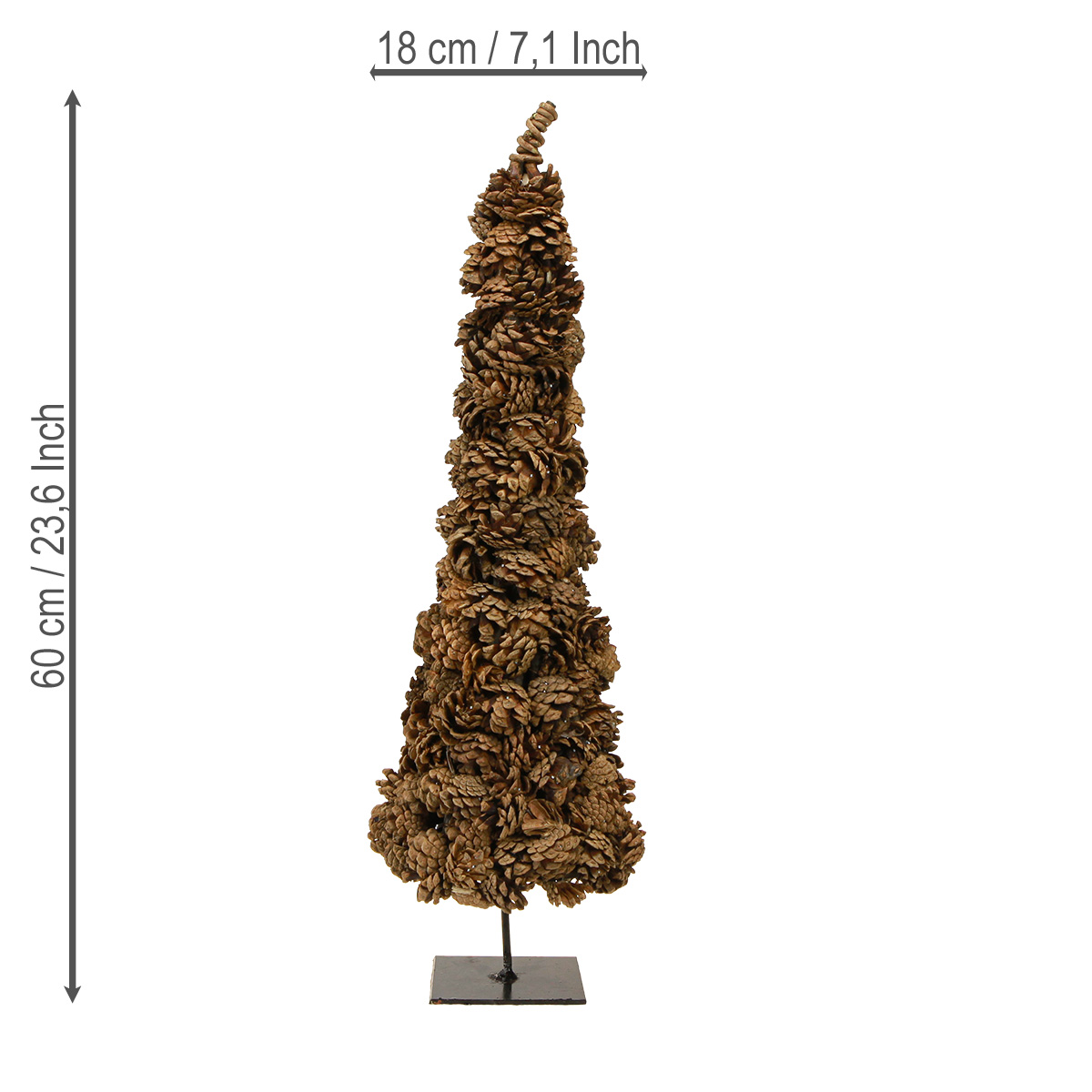 Hergestellt aus hochwertigen Kiefernzapfen, Holz und feinen Details aus Metall sowie Textil, ist dieser Zapfen Weihnachtsbaum ein wahrer Blickfang. Mit einer Höhe von etwa 60 cm und einem Durchmesser von 16 cm ist er so kompakt, dass er selbst auf kleinen Flächen Platz findet. Ideal also für Tische, Sideboards und Fensterbänke!