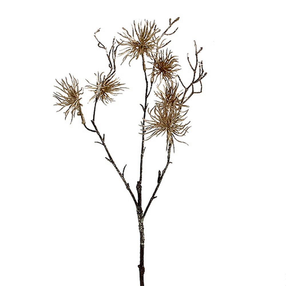 Die Zaubernuss in Gold mit Glitter hat eine Größe von ungefähr 50 Zentimeter und besitzt an jeder ihrer 3 Verzweigungen 2 goldene Blütenköpfe, die ihre Blütenblätter in alle Richtungen austrecken. So sehen die Blüten aus der Ferne ein wenig aus wie kleine Sonnen, auch weil die Blüten so kräftig strahlen. Der Stiel besitzt im Inneren einen biegsamen Draht und lässt sich demnach in die gewünschte Richtung biegen, auch wenn er bereits verarbeitet ist. Außerdem ist der Pflanzenstiel auch wasserfest und kann somit in Sträußen und Gestecken verarbeitet werden, die feucht gehalten werden müssen. Obendrein ist die gesamte Kunstblume mit elegantem silbernen Glitter bestreut. Was für eine schöne Augenweide!