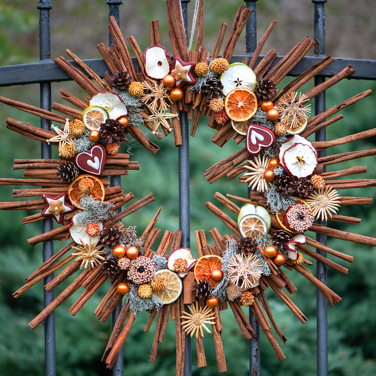 Materialien: Naturmaterialien wie Zapfen, Holz, Rinde, Moos, Zweige, Blätter, Trockenblumen, Seegras und Kokosfasern.