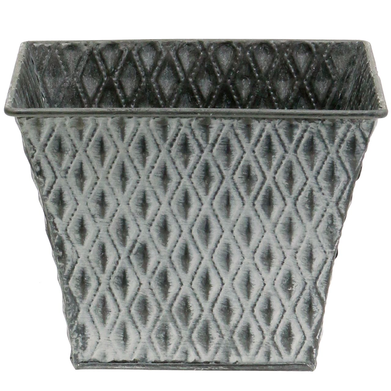 Der quadratisch geformte Zinktopf mit Rautenmuster hat eine Kantenlänge von etwa 18,5 Zentimetern. Die Höhe liegt bei etwa 15 Zentimetern.